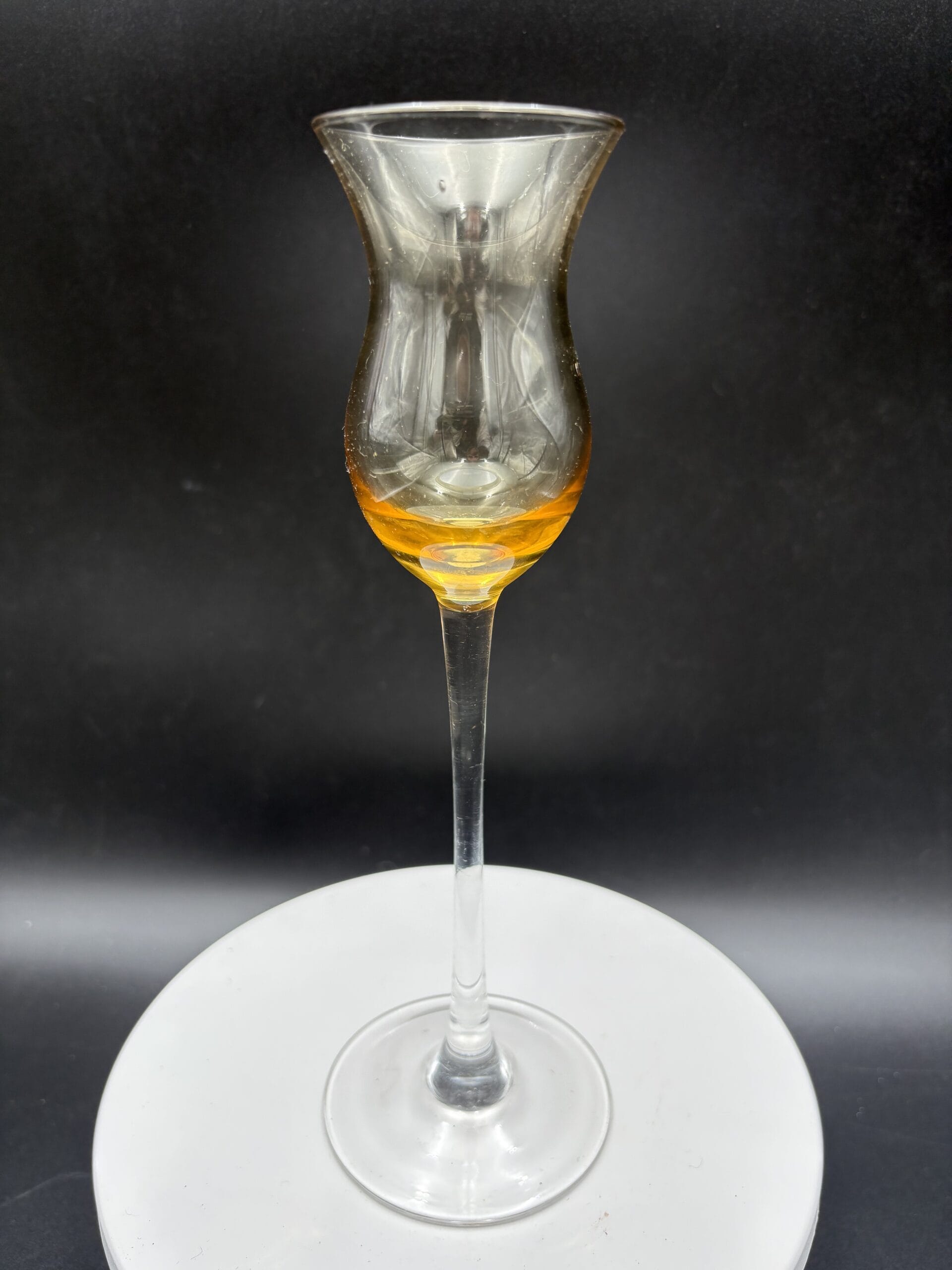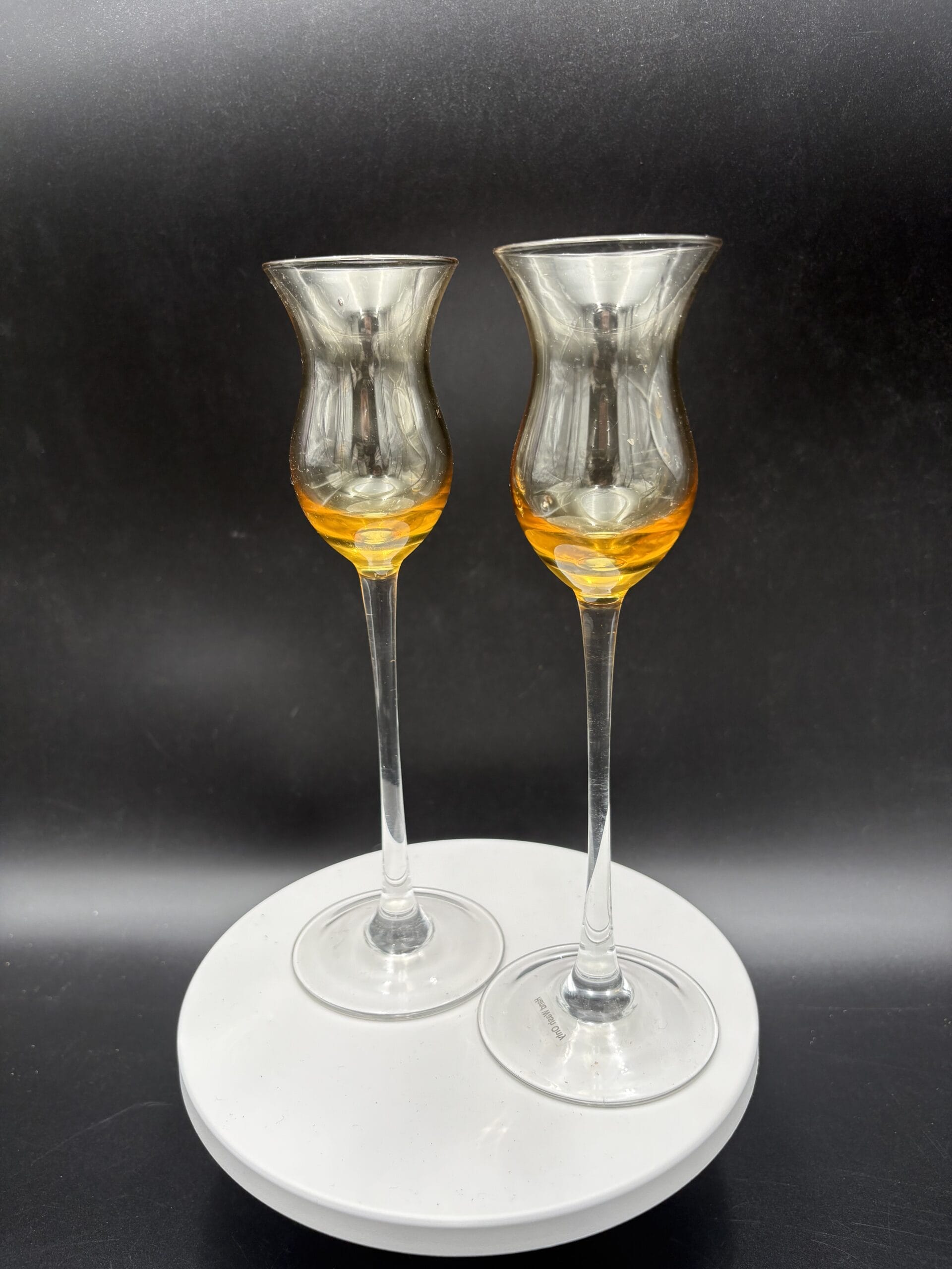2 høje smukke vintage glas. Gule med stilk og fod i klart glas. Begge i fin stand.