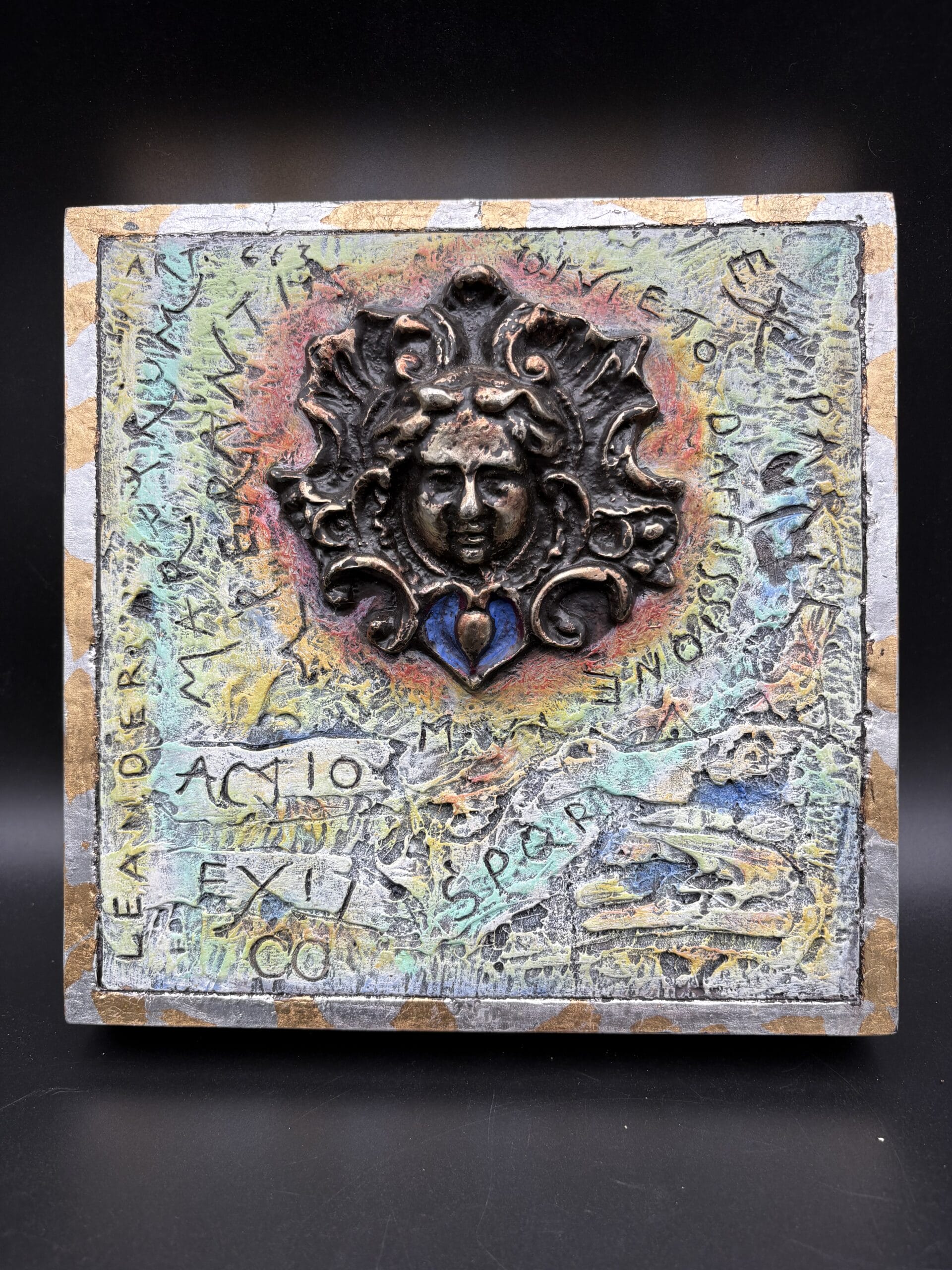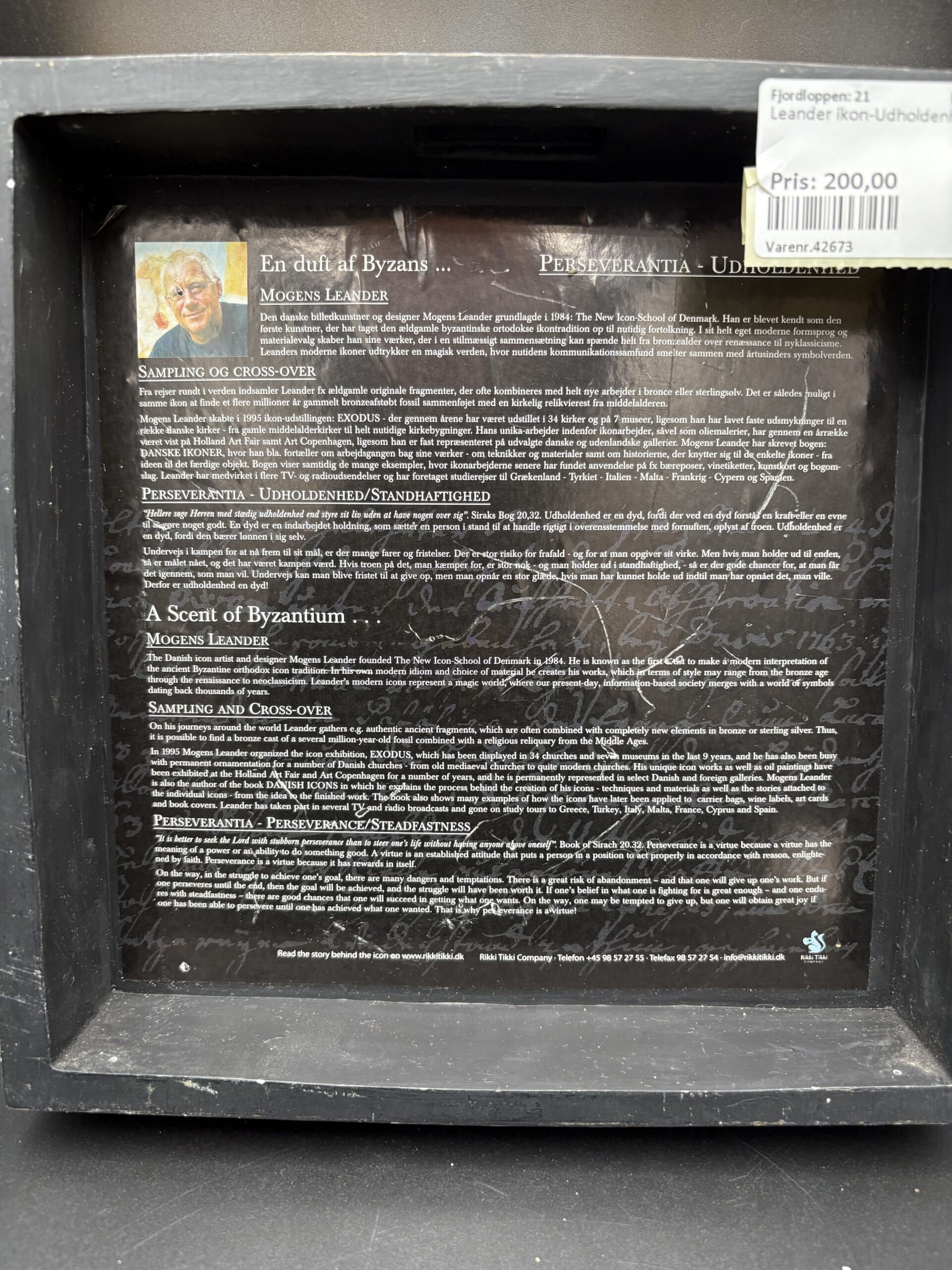 Dette Ikon symbolisere Tapperhed og er i god stand med brugsspor. Mogens Leander har siden 1984 udviklet og arbejdet, med en nyfortolkning, af de ældgamle byzantinske ikoner og hans ikoner, er inspireret af et bredt udvalg af materialer, der kombinerer traditionelle og moderne elementer. Her er nogle af de materiale, der findes i hans værker:
