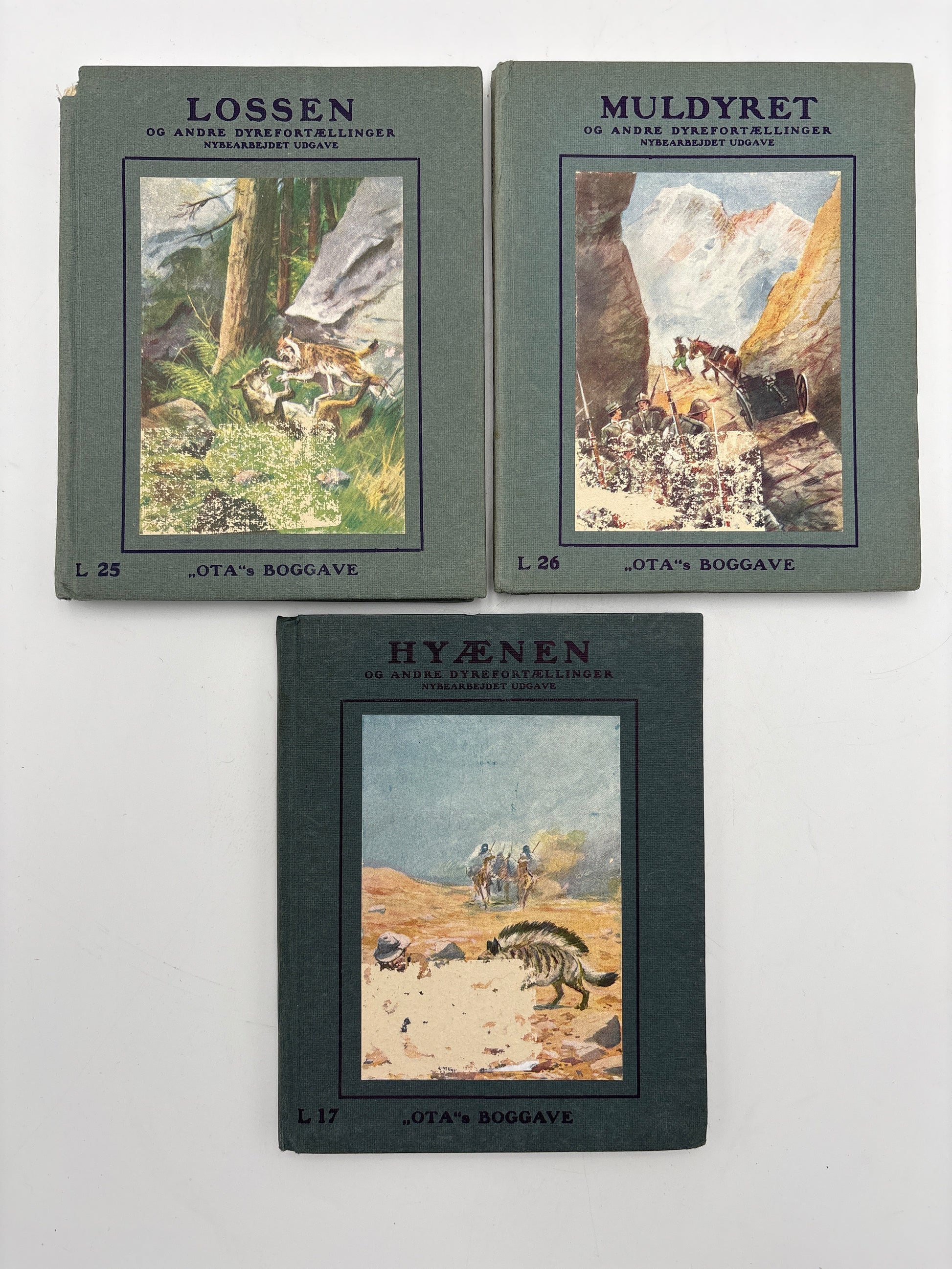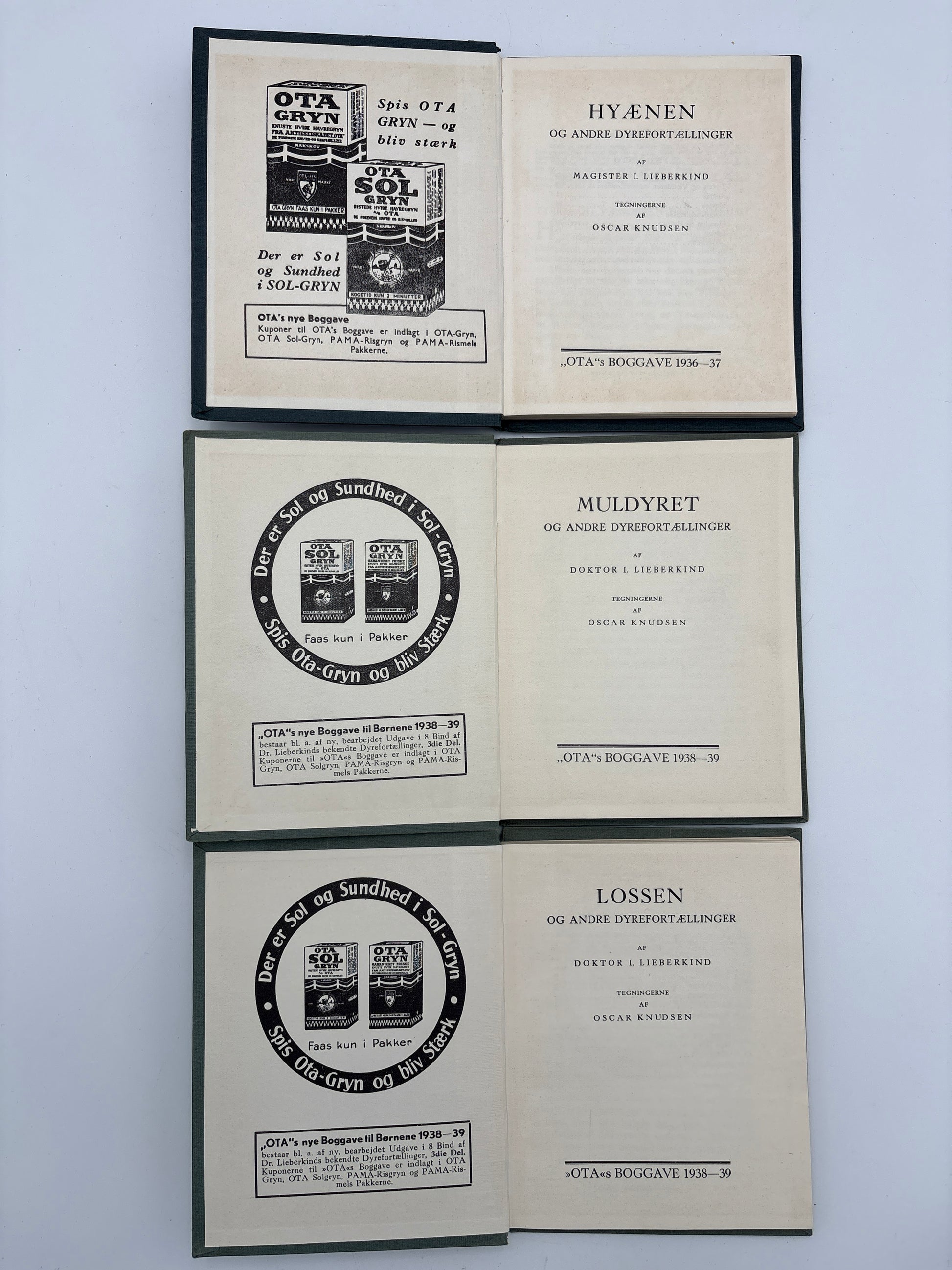 3 små Ota-bøger, udgivet af Ingvald Lieberkind i mellemkrigstiden. Indeni er de i fin stand. Desværre er forsidebilledet ødelagt af et prismærke på dem alle 3 og "Lossen" mangler det øverste hjørne.