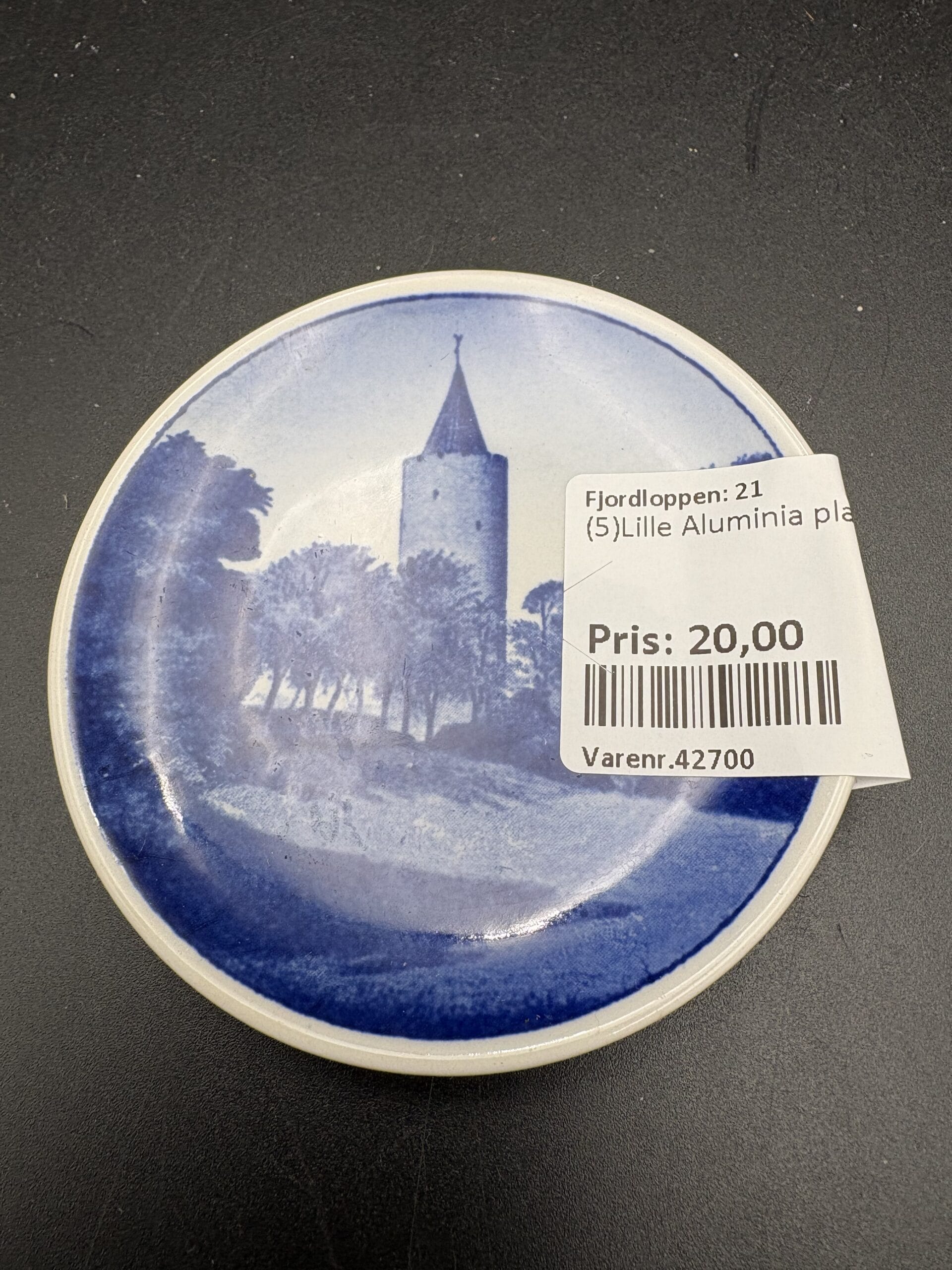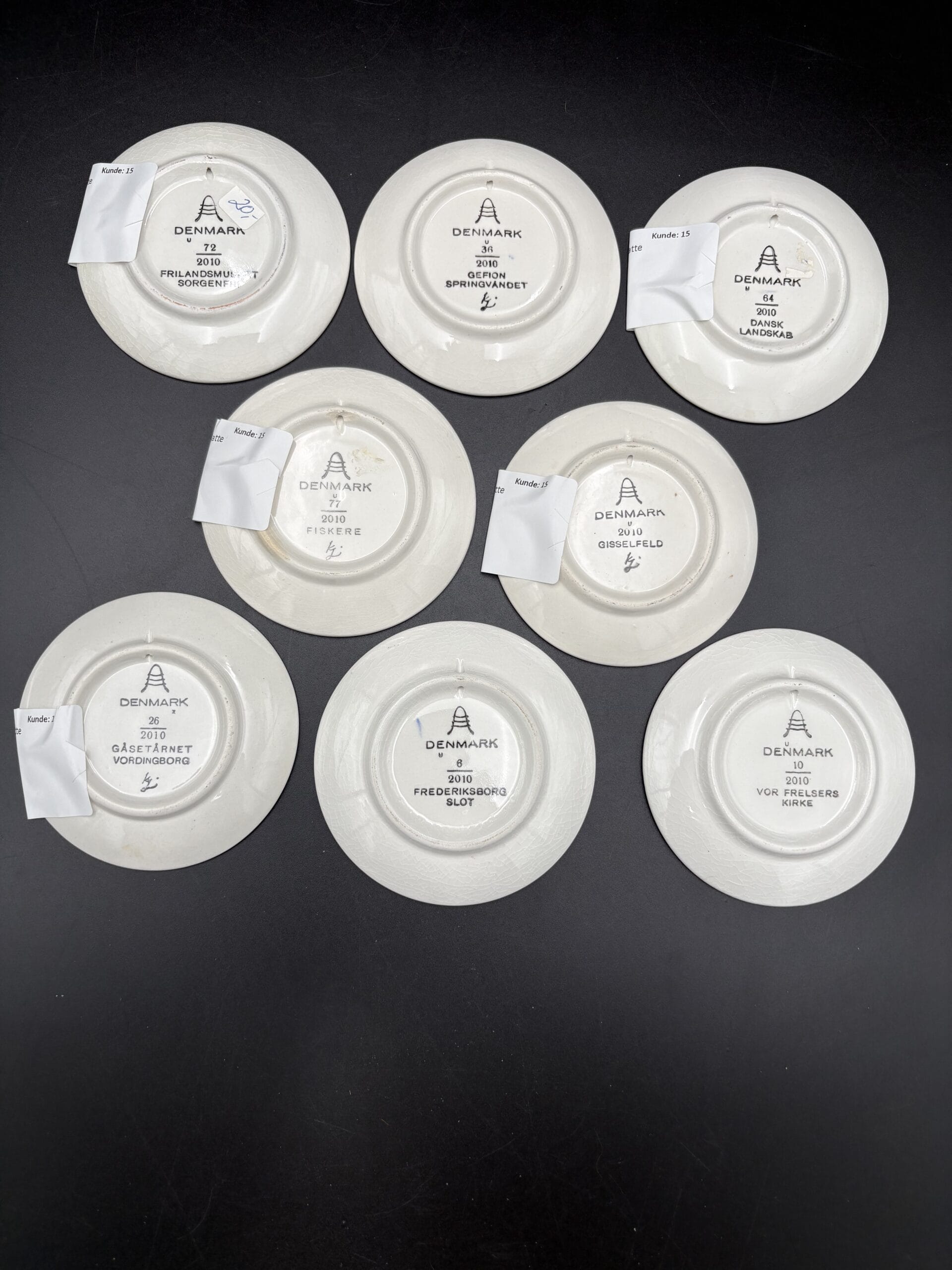 8 små forskellige platter med motiver som; Frilandsmuset i Sorgenfri, Gefion springvandet, Gisselfeldt, Gåsetårnet i Vordingborg, Frederiksborg slot, Vor frelser kirke, Fiskere og det danske landskab. Alle med hul til ophæng bagpå og i fin stand. Da Aluminia er så gammelt, ser man ofte krakeleringer i glasuren, glasurfejl samt brugsspor. Hvis varen er i fin stand, menes det, at der ikke, er gennemgående revner, afslag eller kraftig misfarvning.