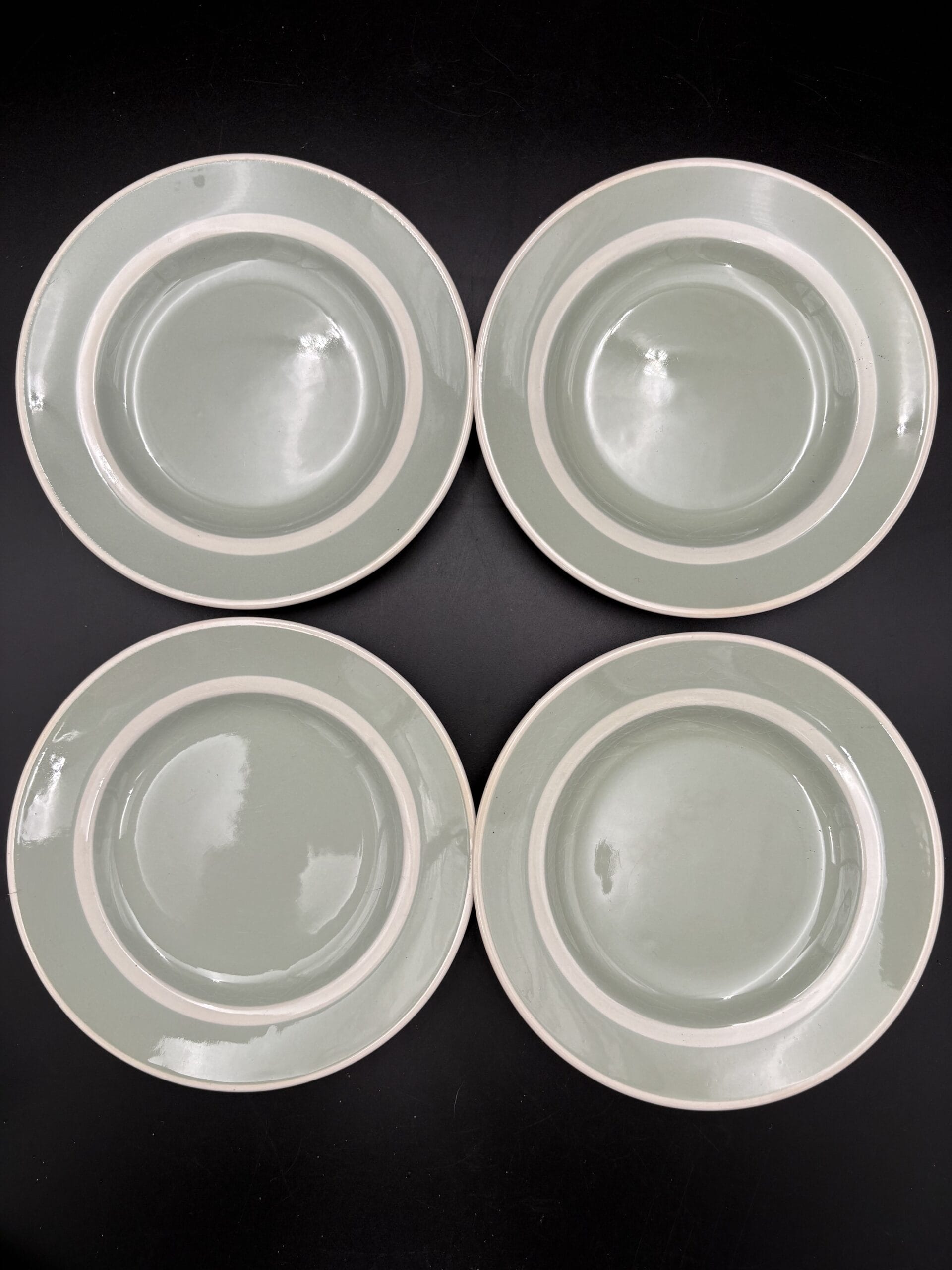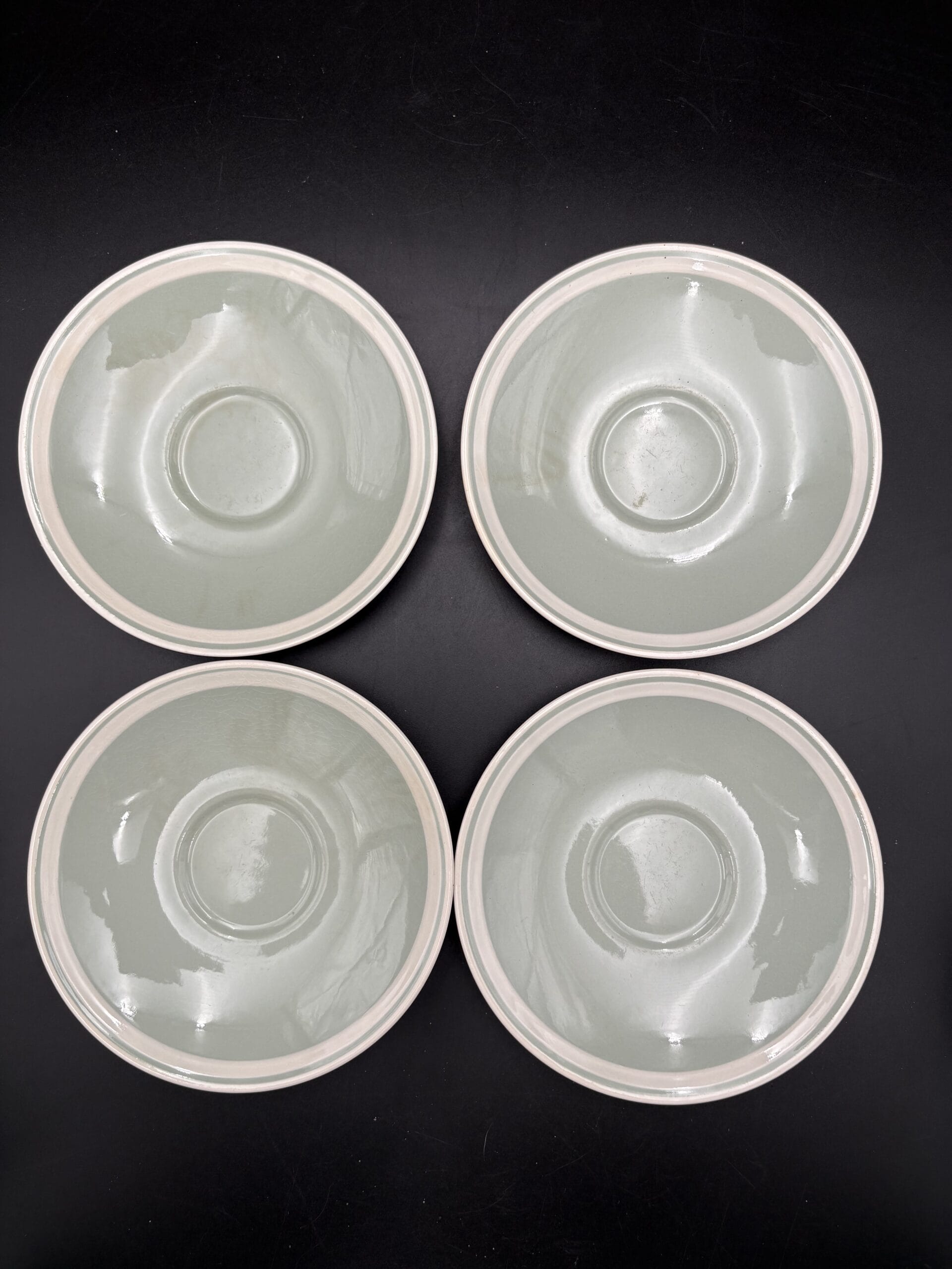 4 par kaffekopper med underkop og kagetallerken, samt sukkerskål og flødekande i mintgrøn. Alle med en let misfarvning. Ellers i god stand. Da Aluminia er så gammelt, ser man ofte krakeleringer i glasuren, glasurfejl samt brugsspor. Hvis varen er i fin stand, menes det, at der ikke, er gennemgående revner, afslag eller kraftig misfarvning.
