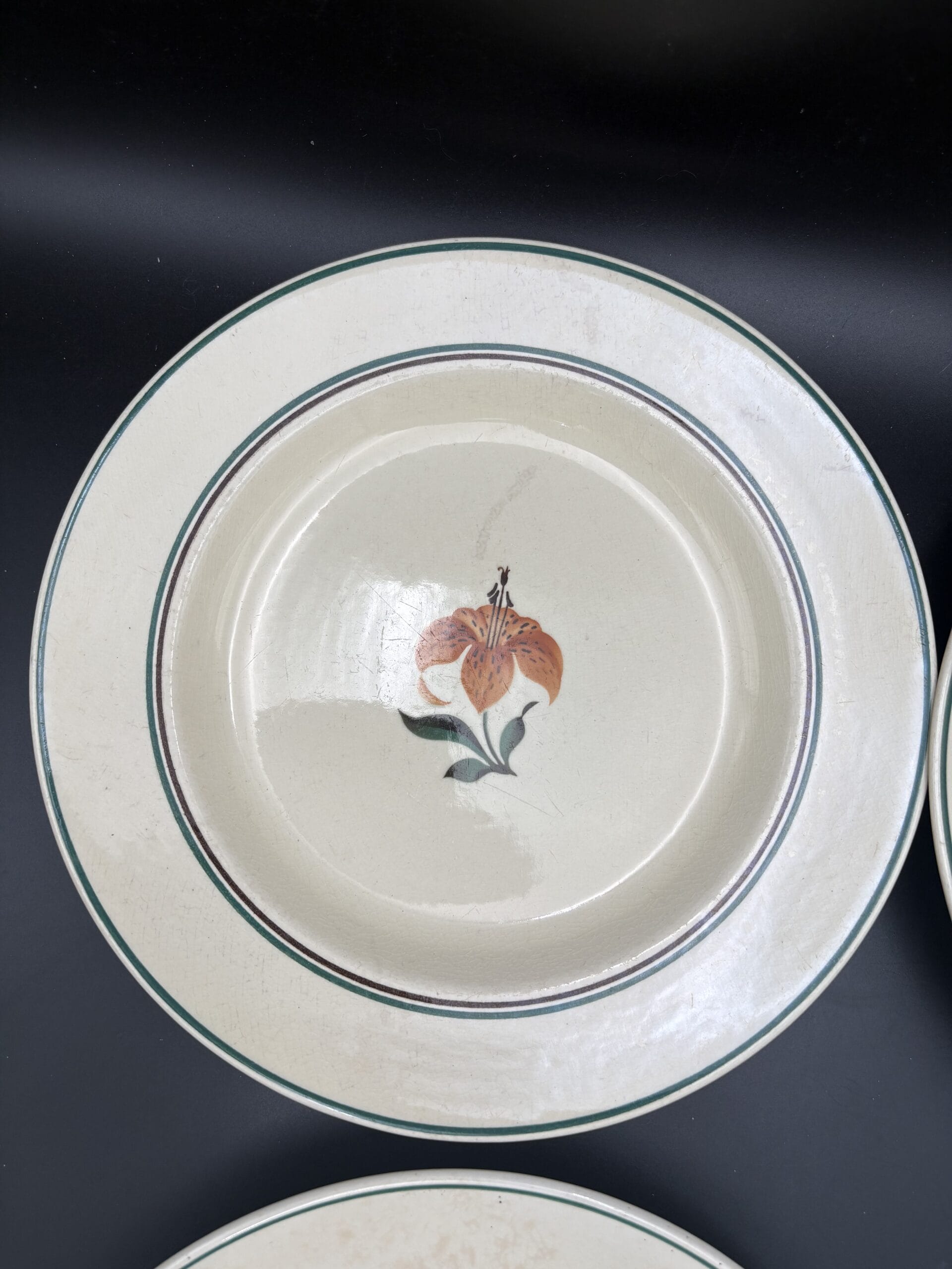 4 stk. flade tallerkner,ca. ø23,5 h.2,5 cm i nogenlunde stand, med let misfarvning. Da Aluminia er så gammelt, ser man ofte krakeleringer i glasuren, glasurfejl samt brugsspor. Hvis varen er i fin stand, menes det, at der ikke, er gennemgående revner, afslag eller kraftig misfarvning.