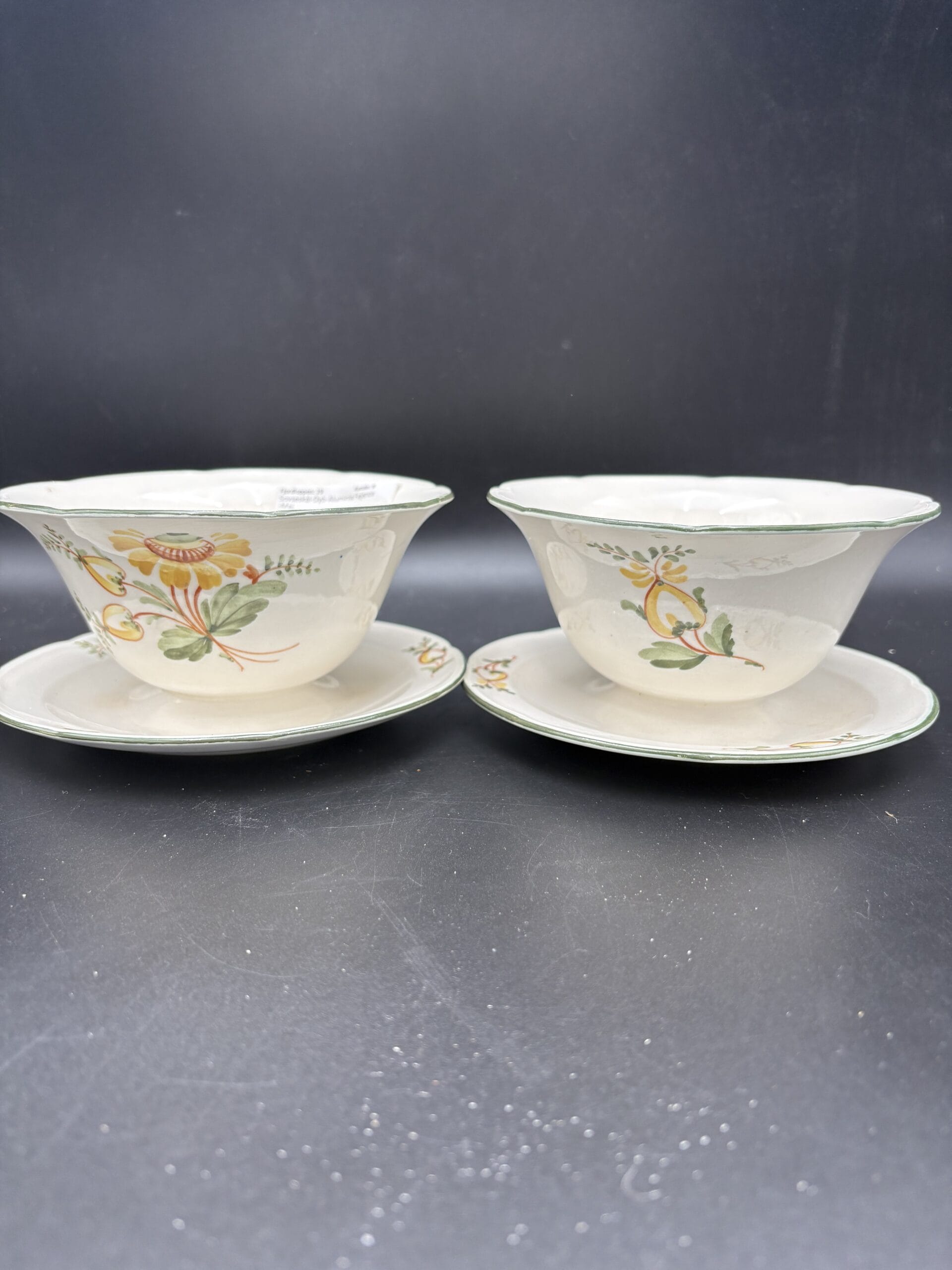 Fine sovseskåle i god stand. Prisen er pr. styk. Den ene er misfarvet i bunden. Den pæneste vil blive sendt først. Da Aluminia er så gammelt, ser man ofte krakeleringer i glasuren, glasurfejl samt brugsspor. Hvis varen er i fin stand, menes det, at der ikke, er gennemgående revner, afslag eller kraftig misfarvning.
