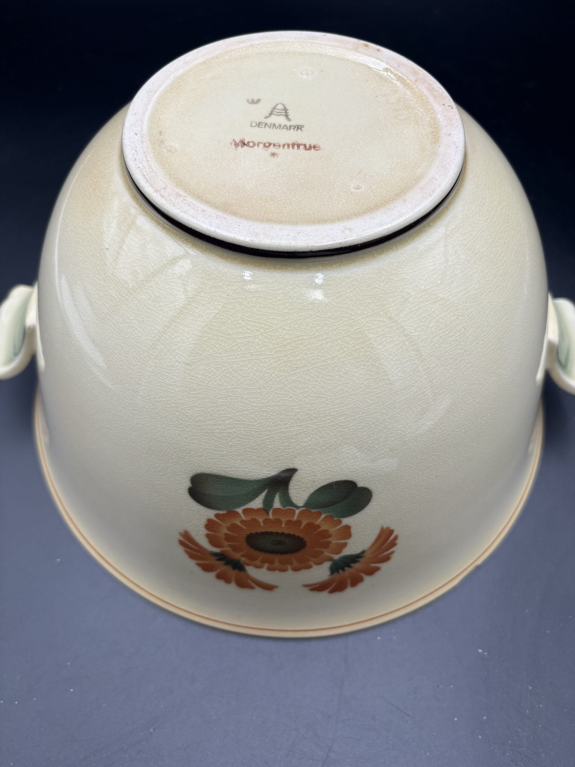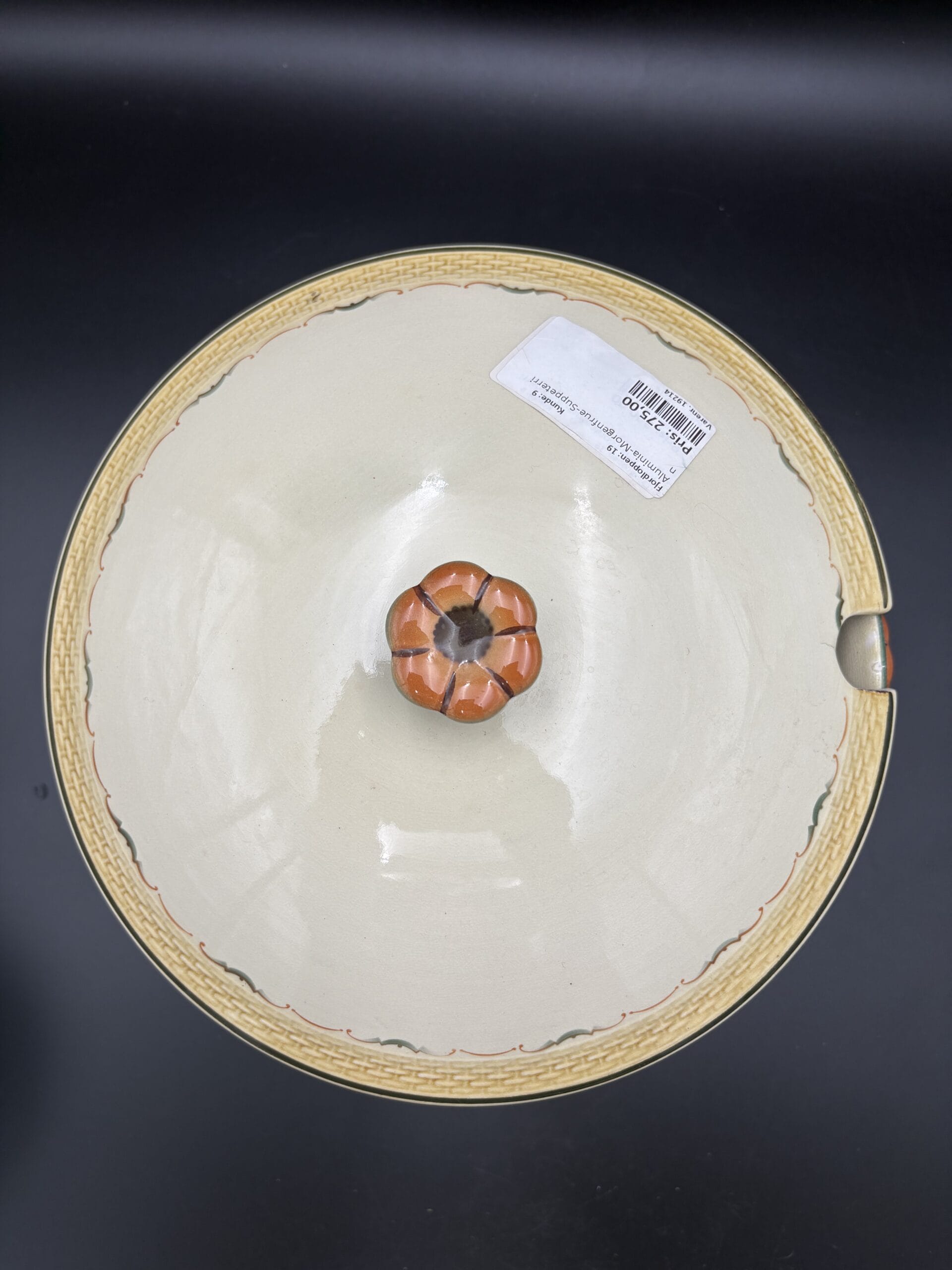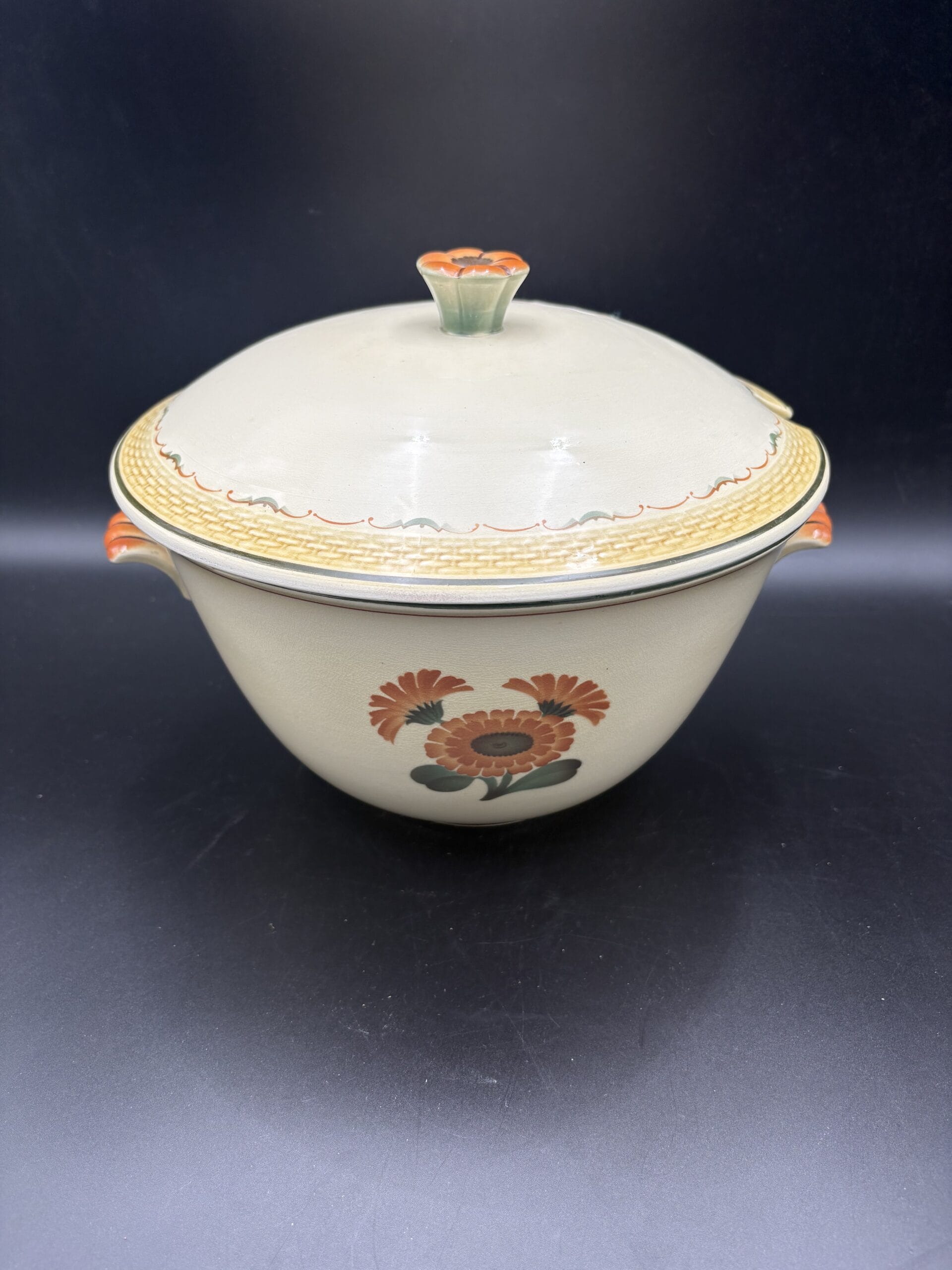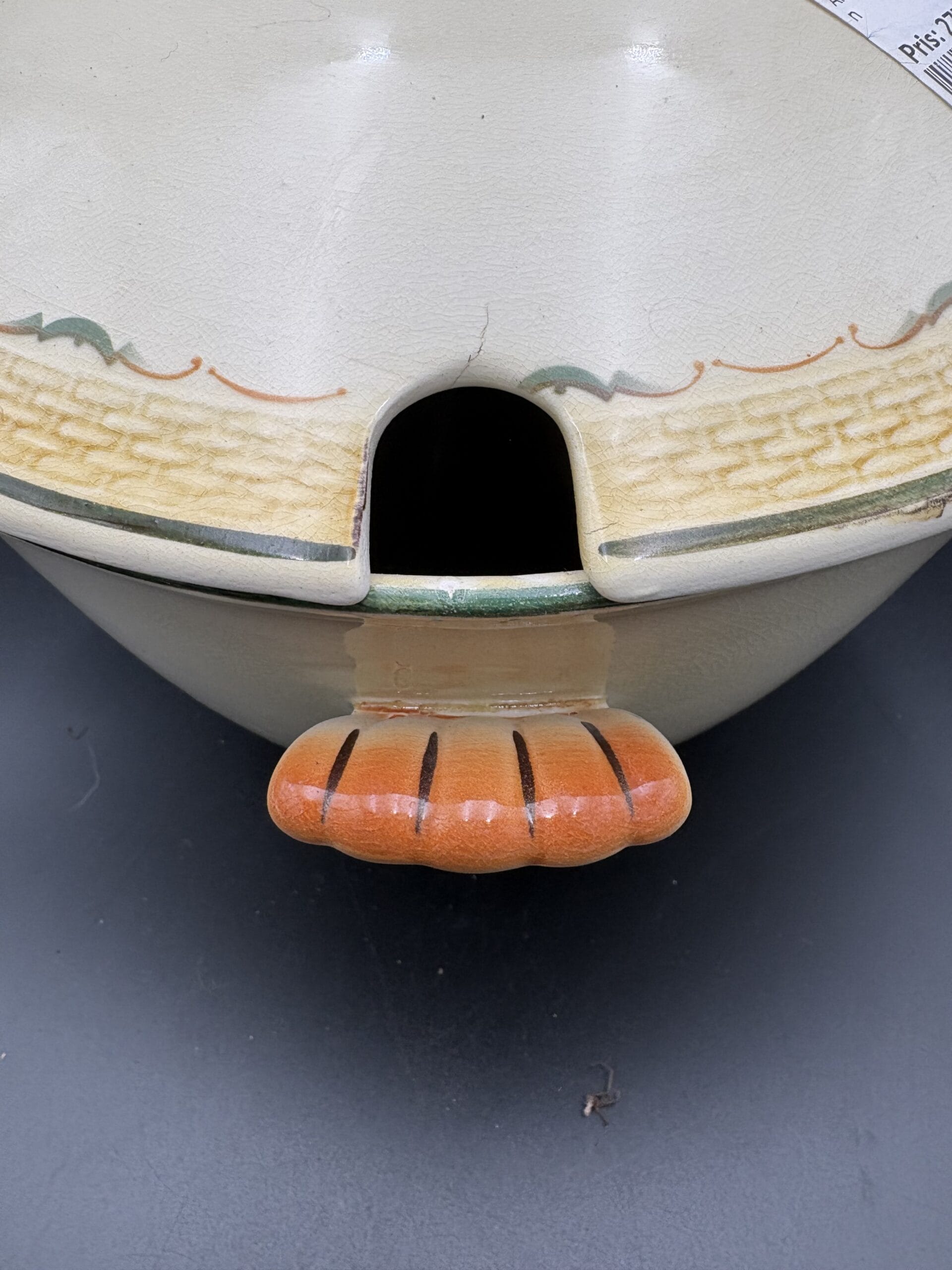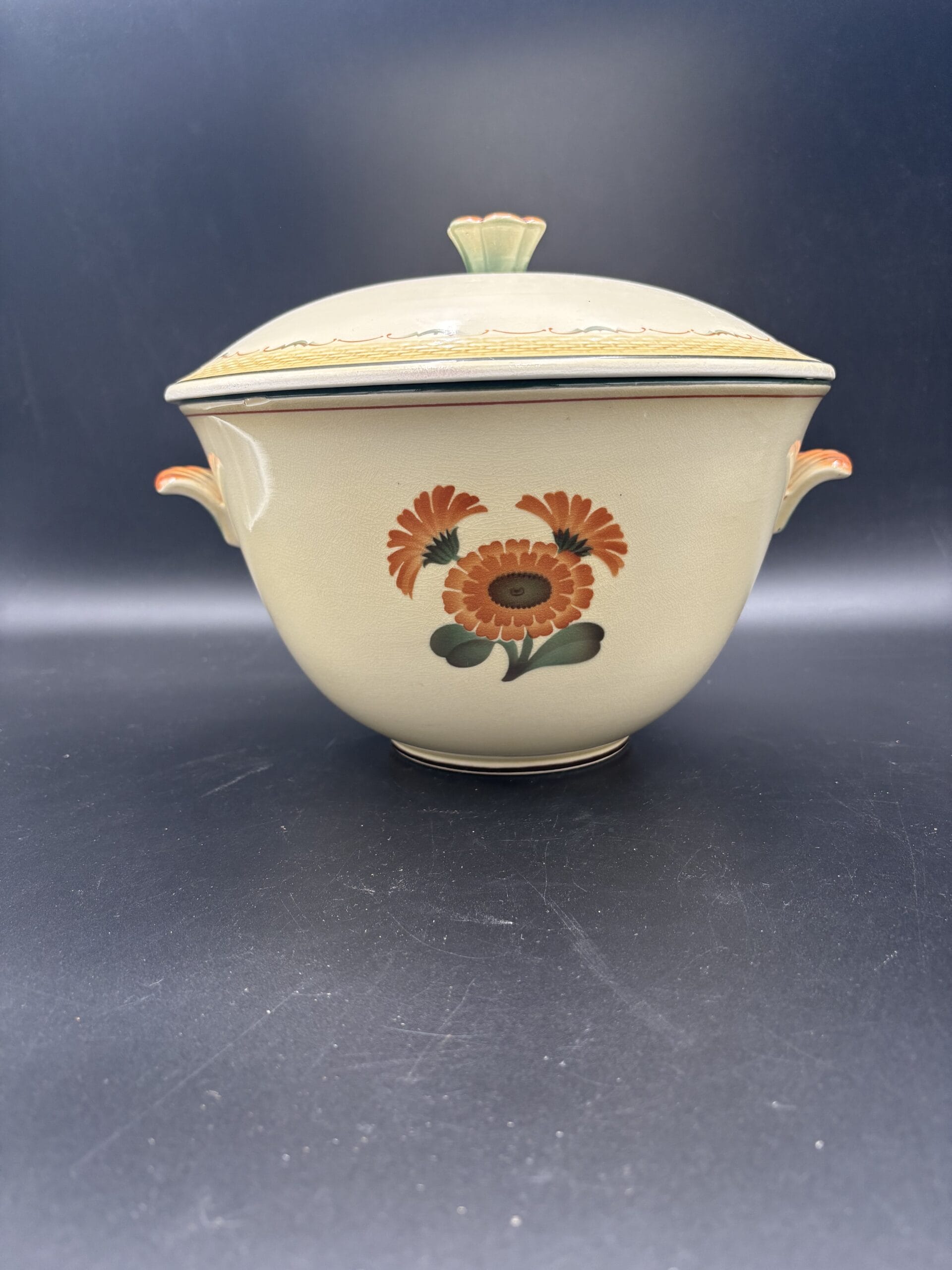 Stort , flot terrin, ca. ø26cm, med få brugsspor. Der er en hårfin revne, ved hullet i låget og et par meget små afslag, på kanten. Alt i alt i god stand. Da Aluminia er så gammelt, ser man ofte krakeleringer i glasuren, glasurfejl samt brugsspor. Hvis varen er i fin stand, menes det, at der ikke, er gennemgående revner, afslag eller kraftig misfarvning.
