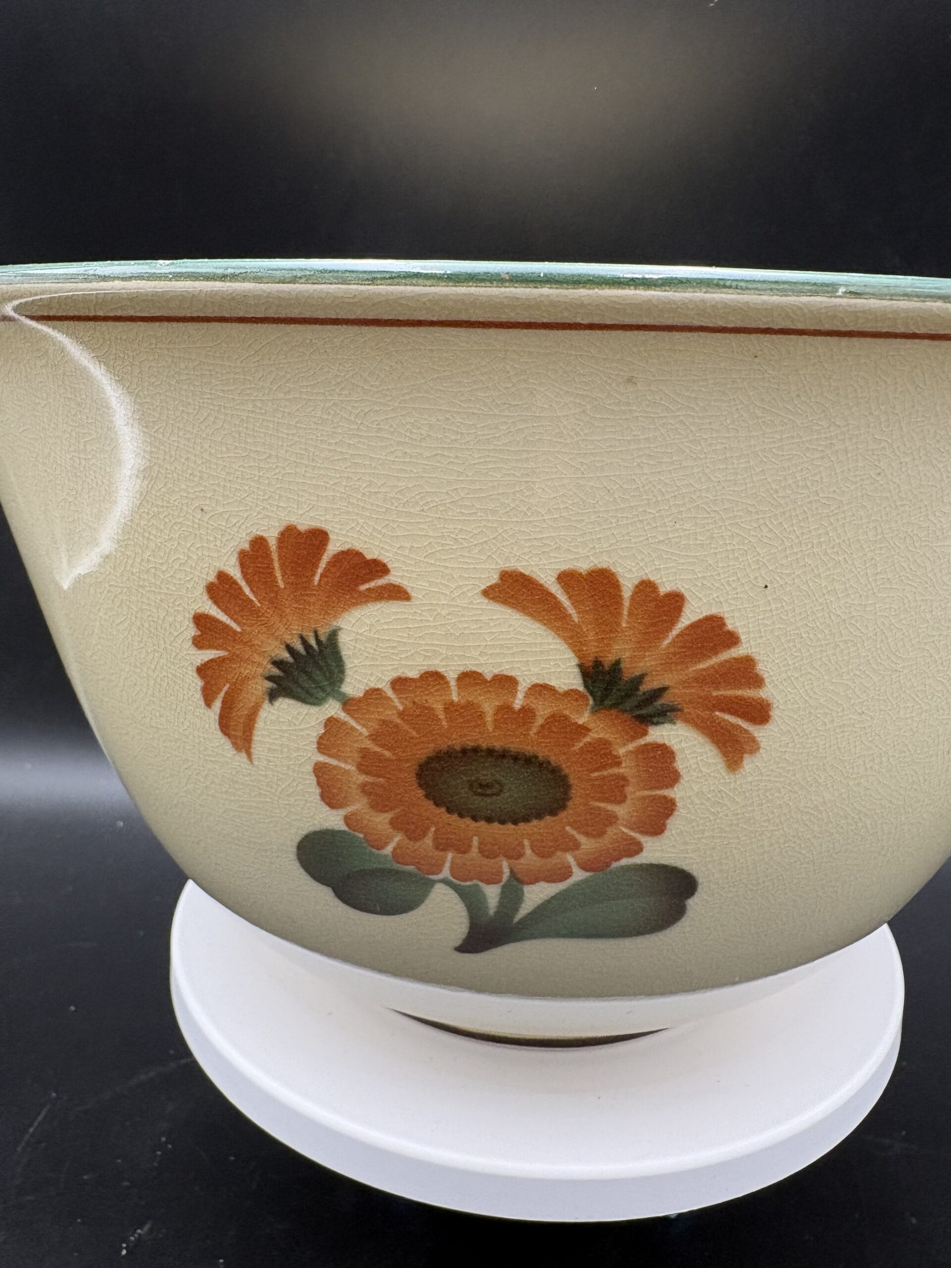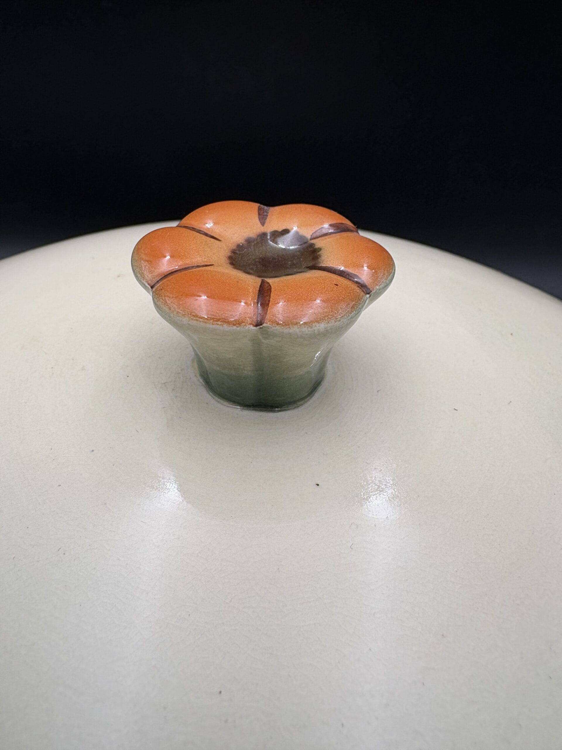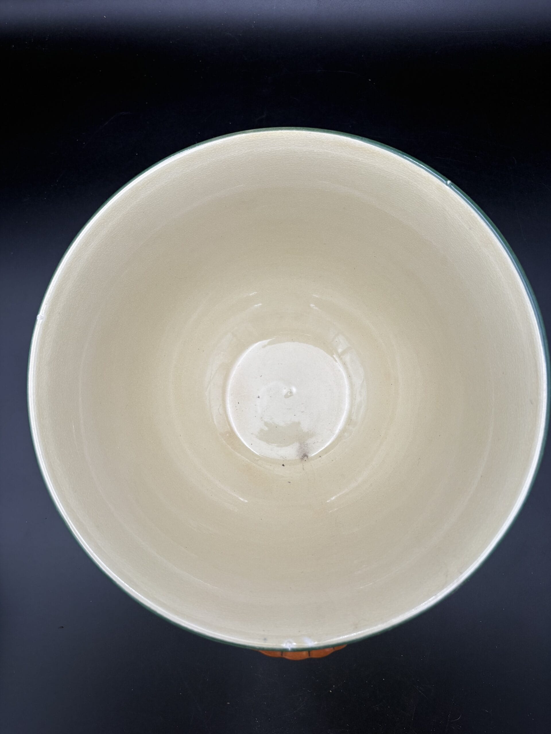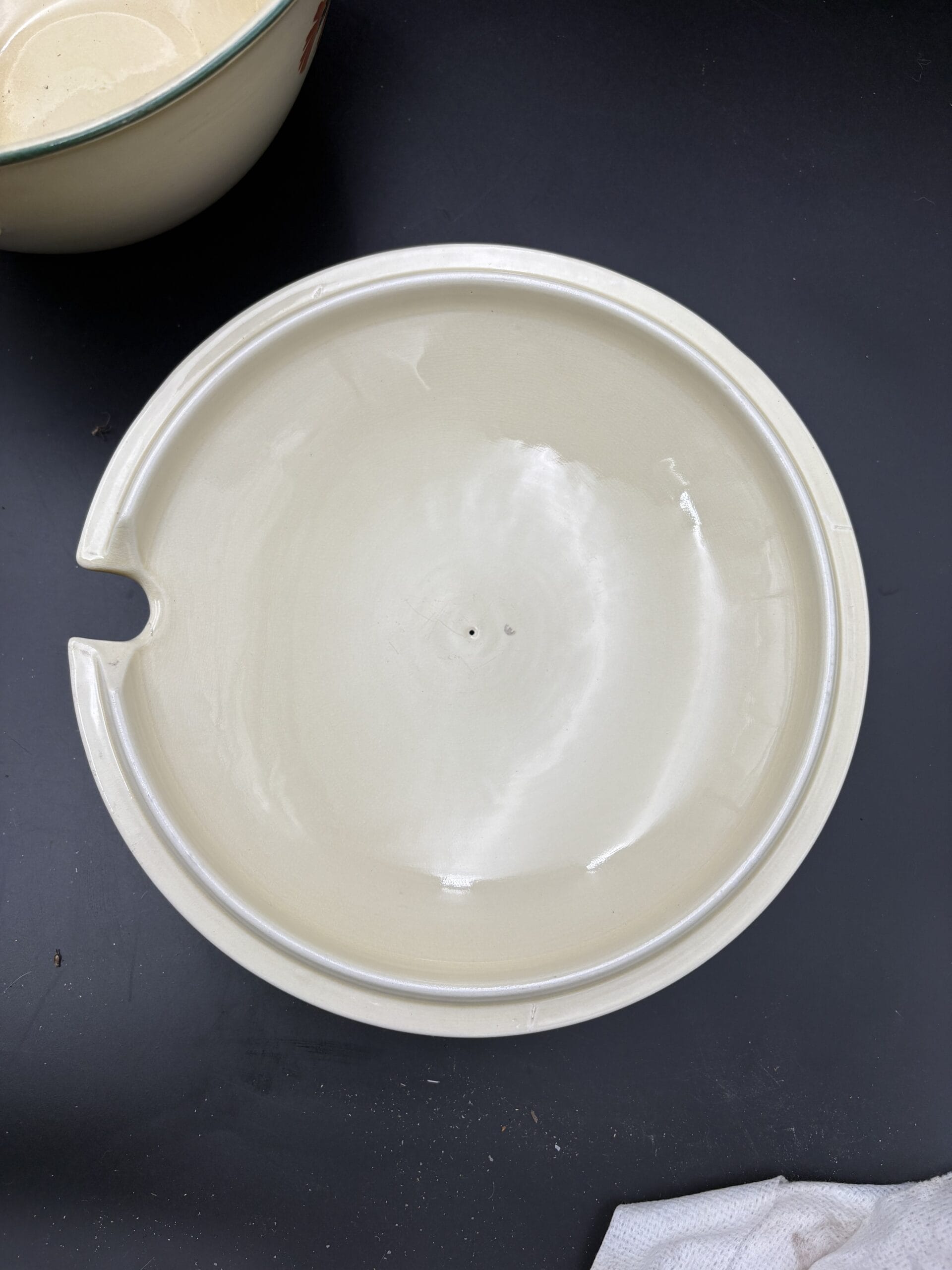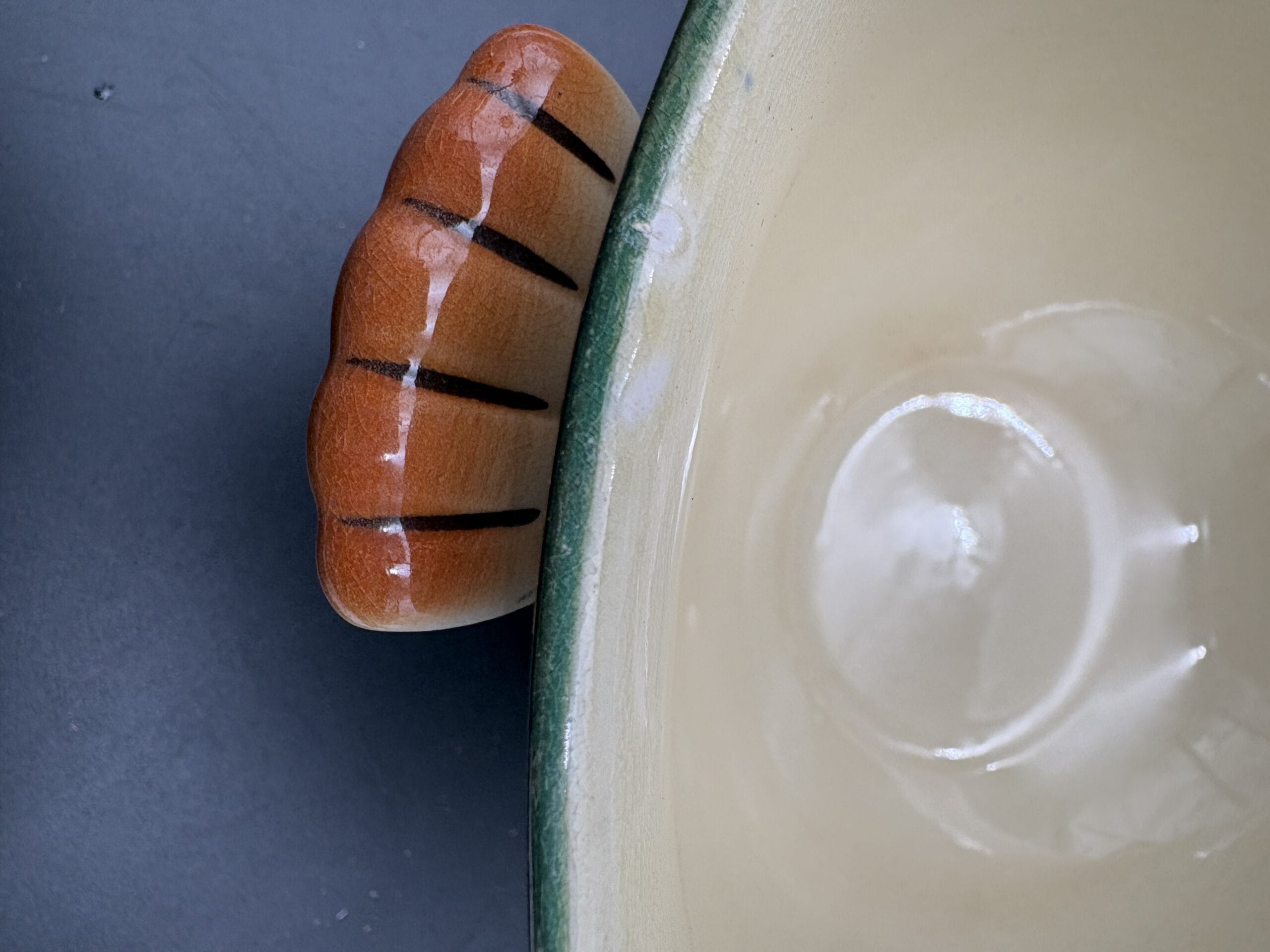Stort , flot terrin, ca. ø26cm, med få brugsspor. Der er en hårfin revne, ved hullet i låget og et par meget små afslag, på kanten. Alt i alt i god stand. Da Aluminia er så gammelt, ser man ofte krakeleringer i glasuren, glasurfejl samt brugsspor. Hvis varen er i fin stand, menes det, at der ikke, er gennemgående revner, afslag eller kraftig misfarvning.