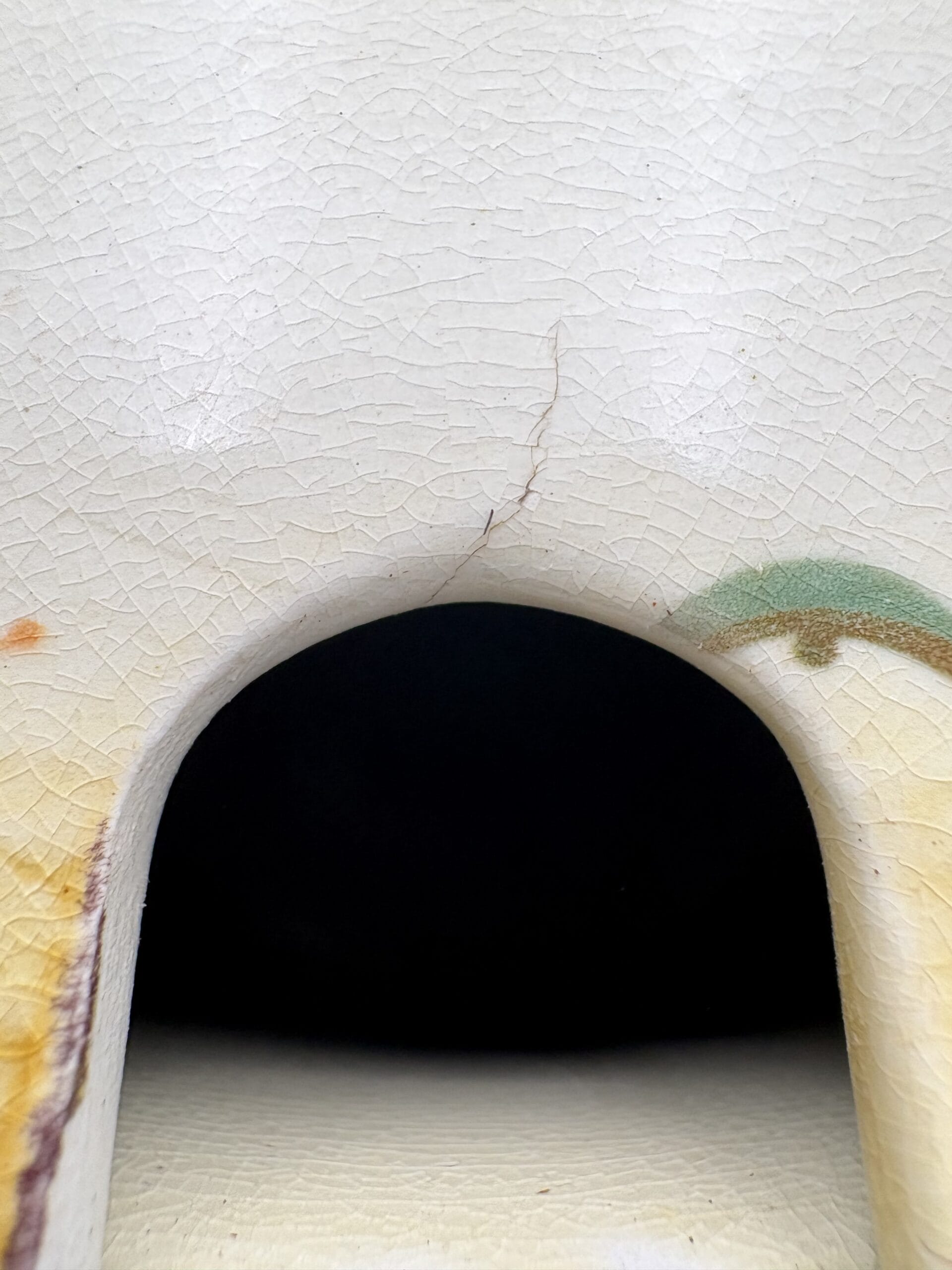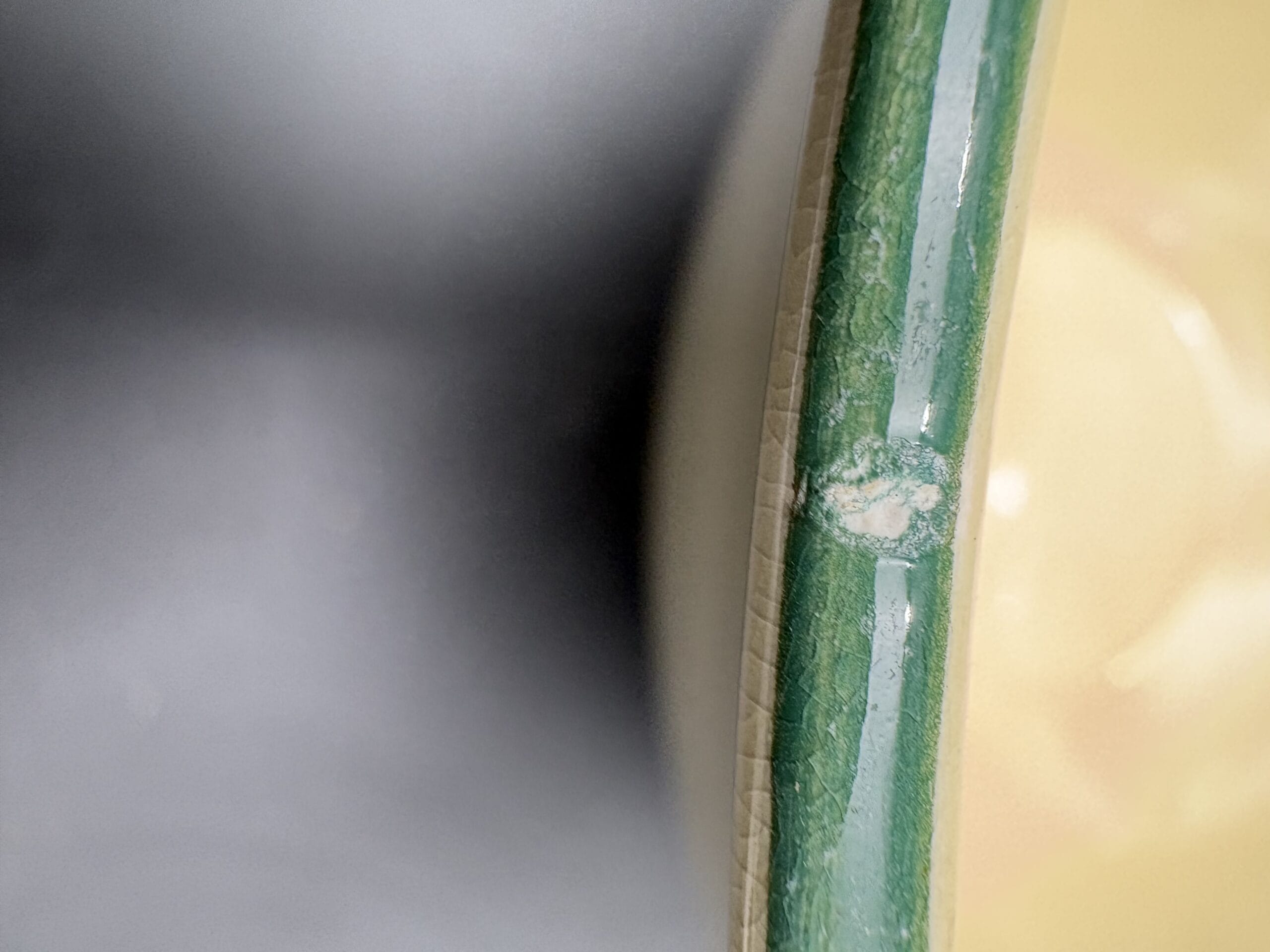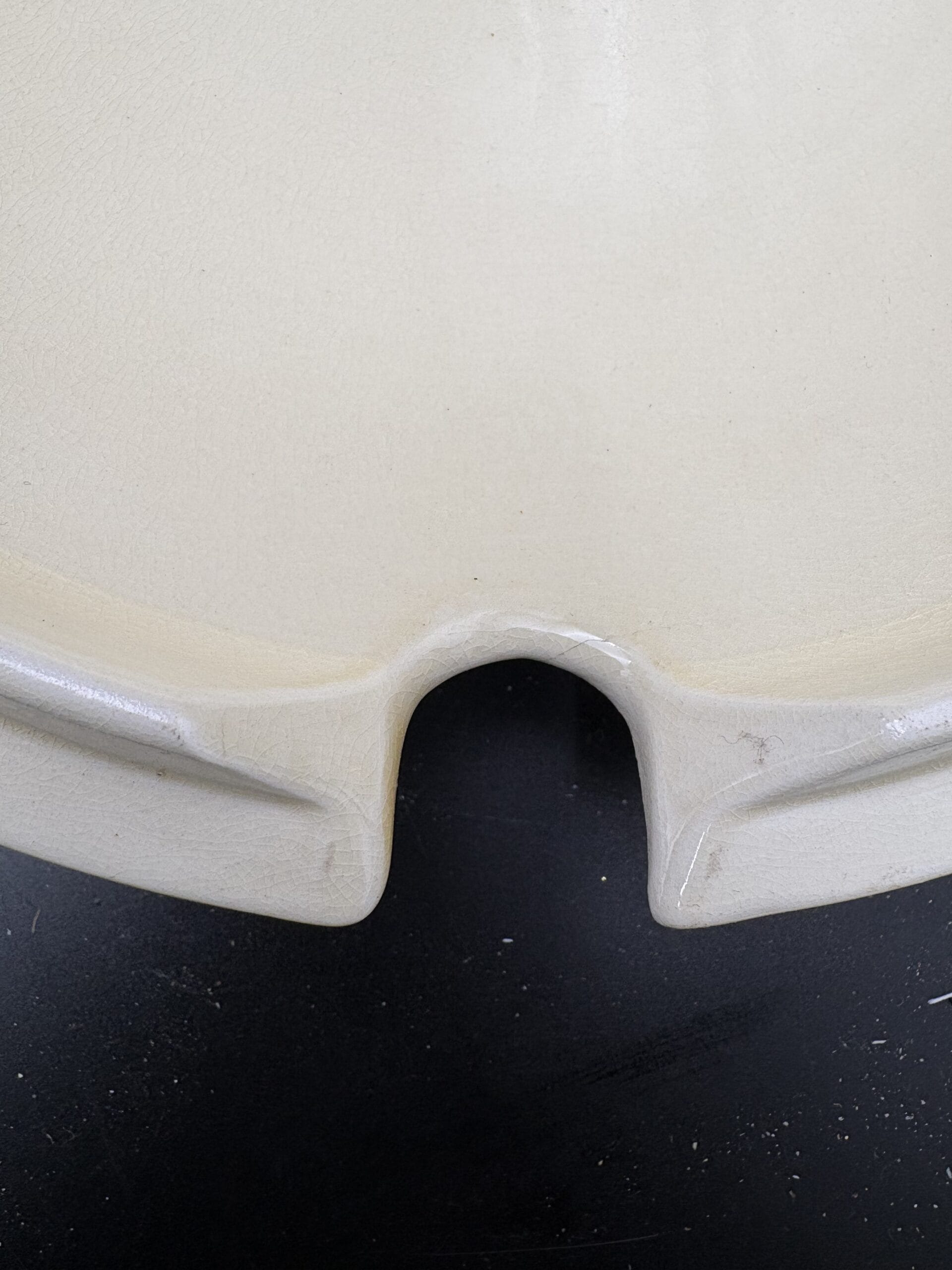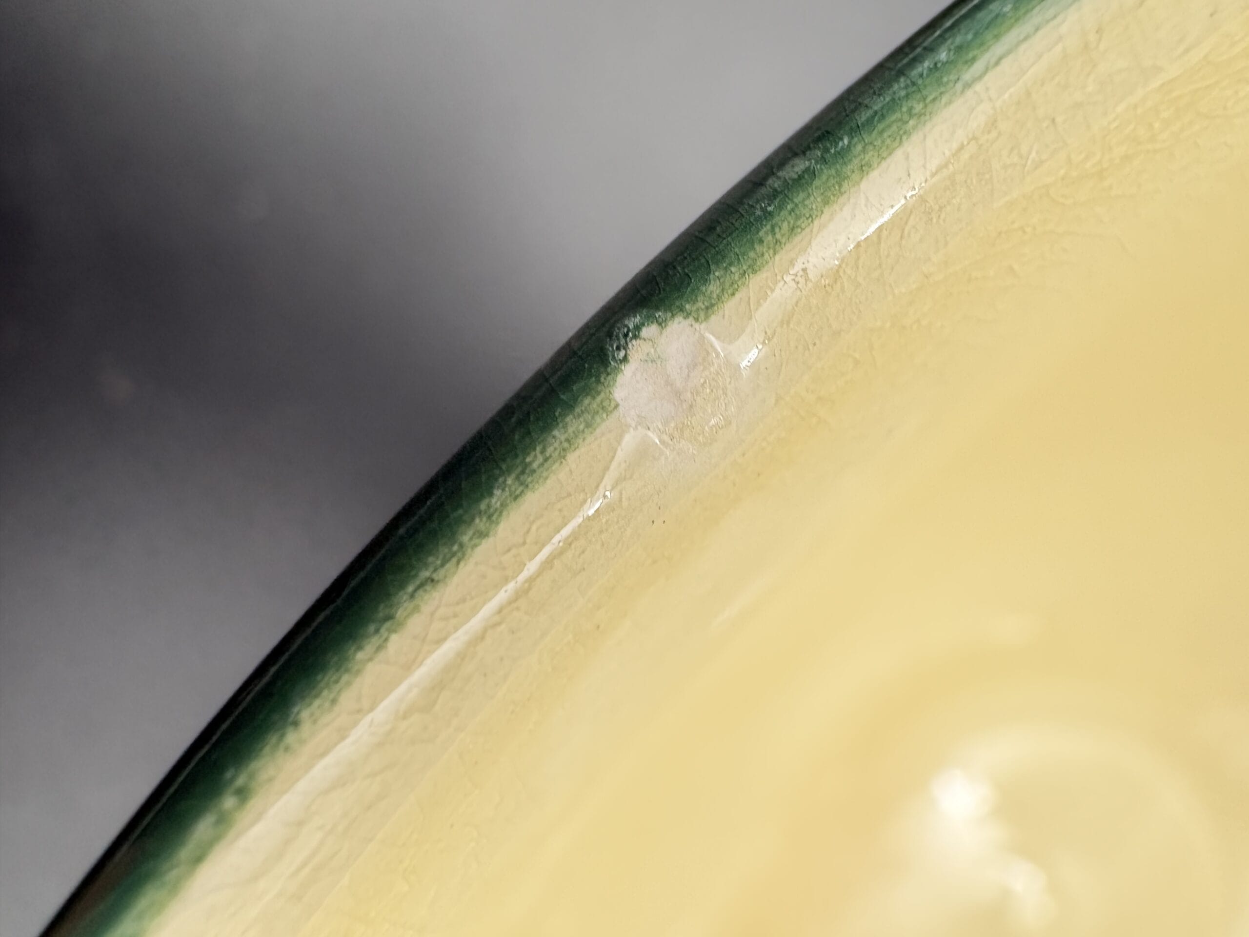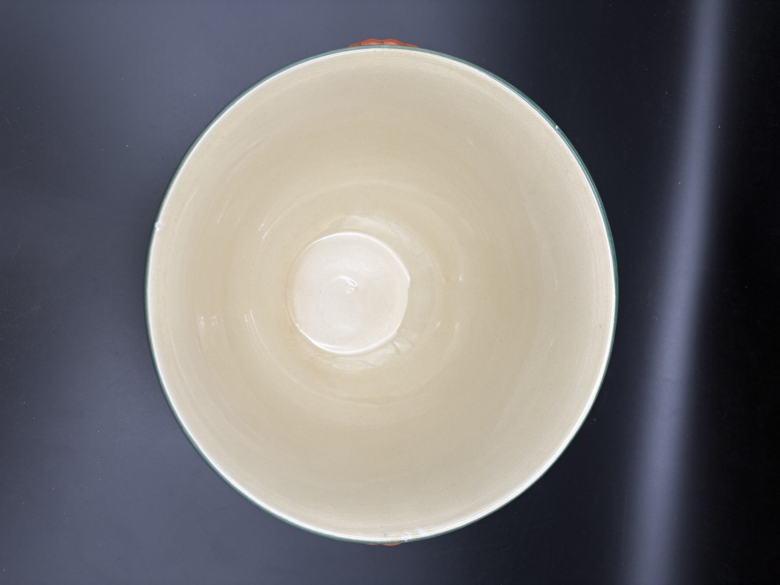 Stort , flot terrin, ca. ø26cm, med få brugsspor. Der er en hårfin revne, ved hullet i låget og et par meget små afslag, på kanten. Alt i alt i god stand. Da Aluminia er så gammelt, ser man ofte krakeleringer i glasuren, glasurfejl samt brugsspor. Hvis varen er i fin stand, menes det, at der ikke, er gennemgående revner, afslag eller kraftig misfarvning.