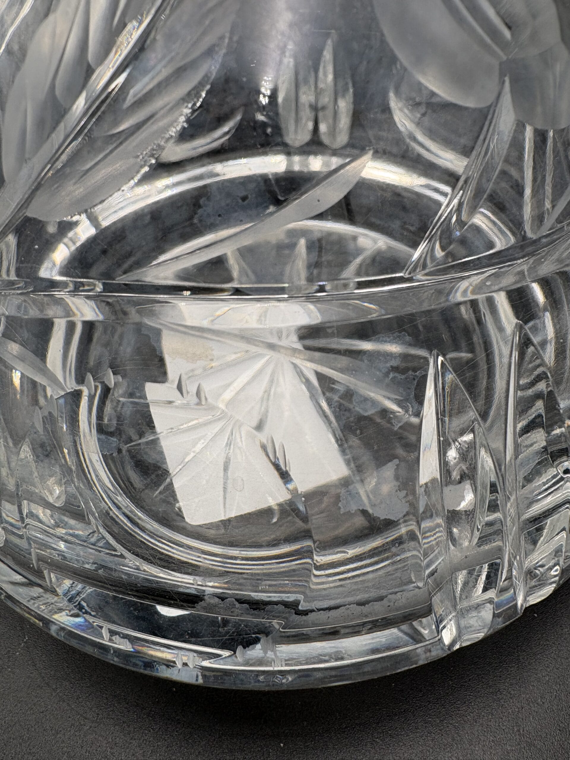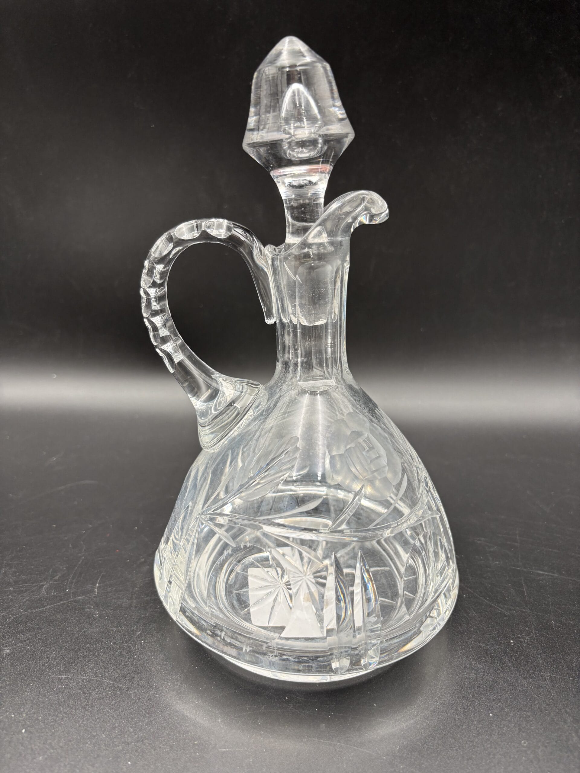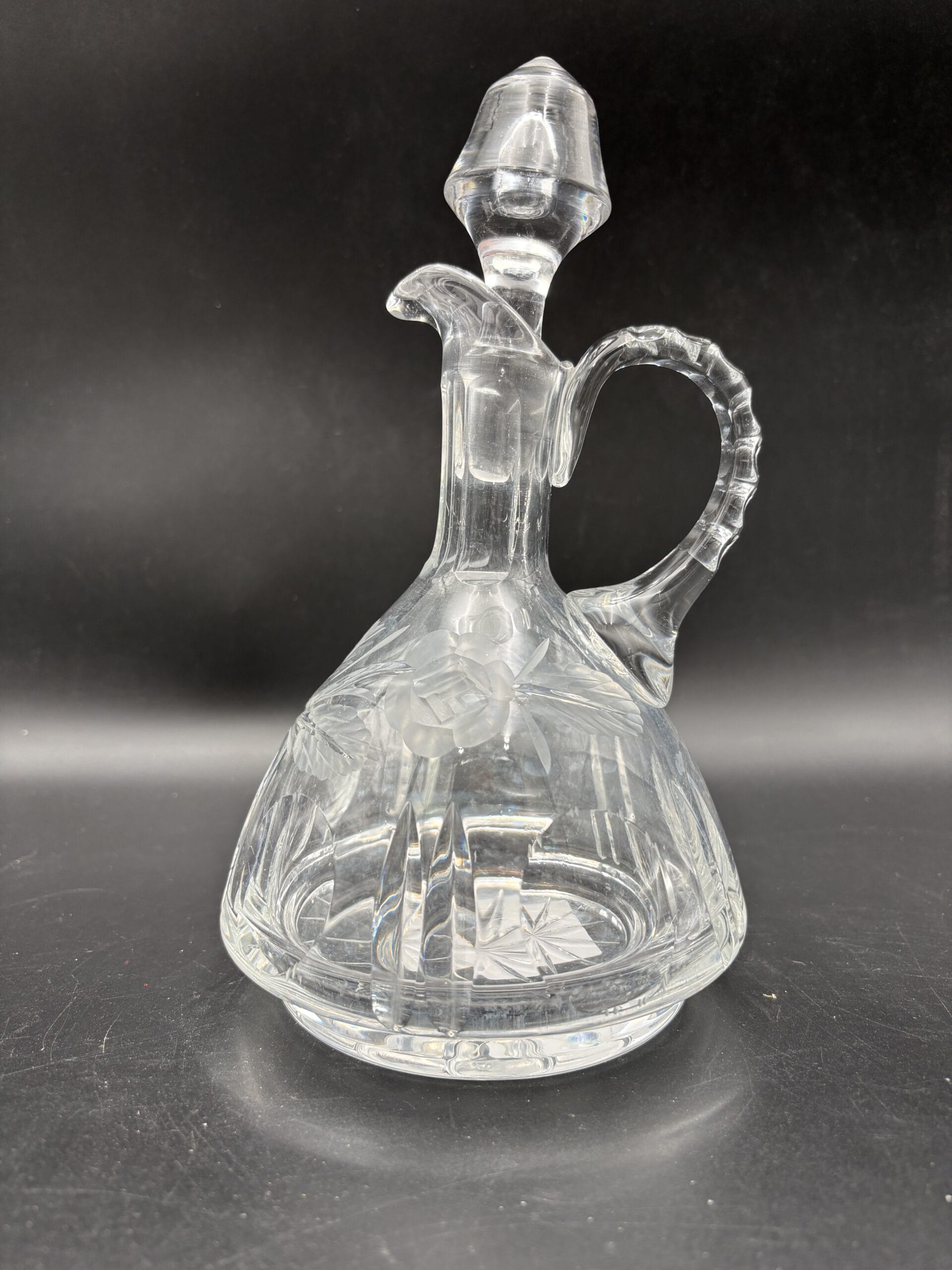 Smuk gammel krystal karaffel med facet slebne roser af ukendt oprindelse. Den er i fin stand, men trænger til en rengøring. Højden 23cm er inklusiv proppen.