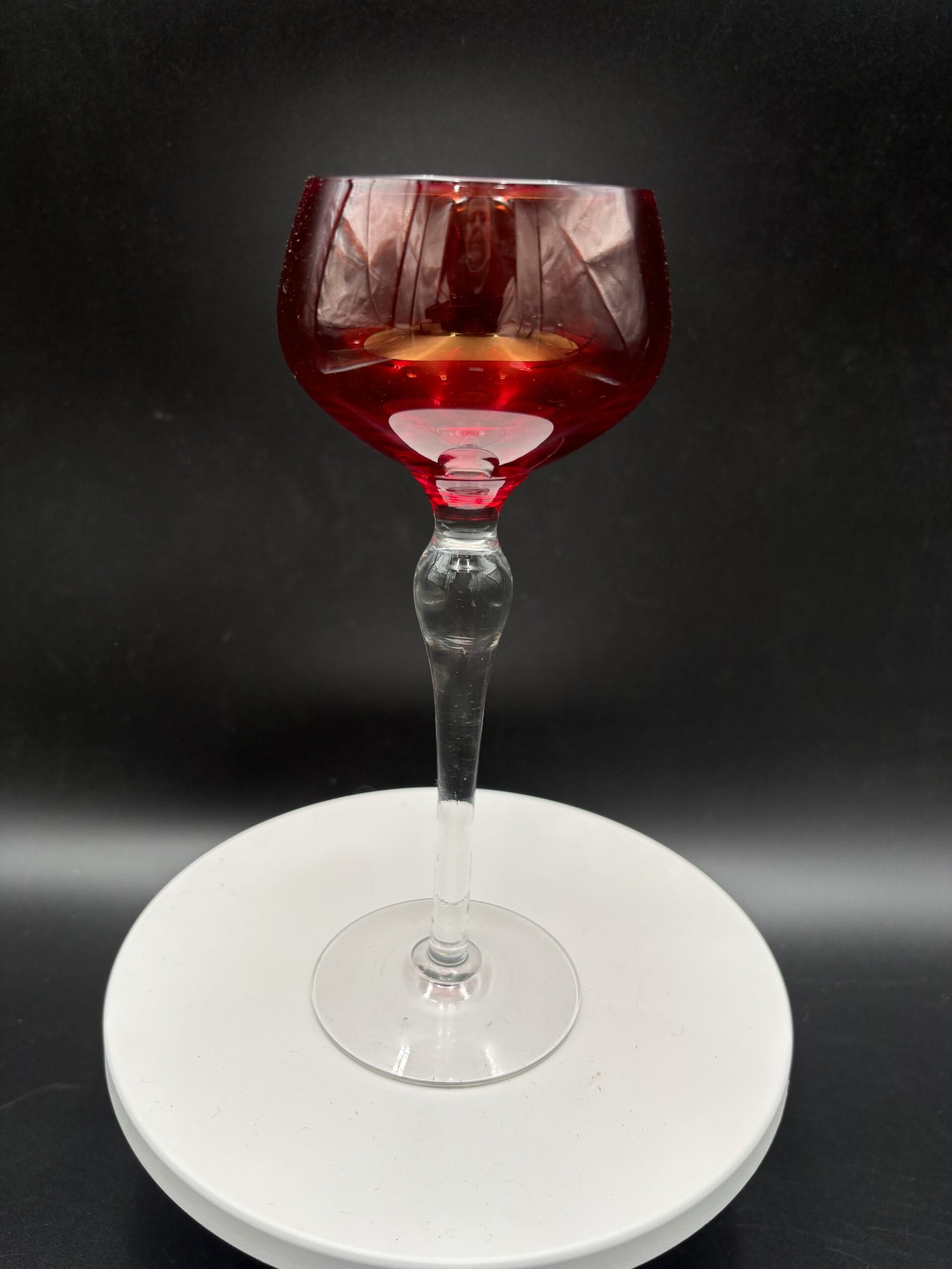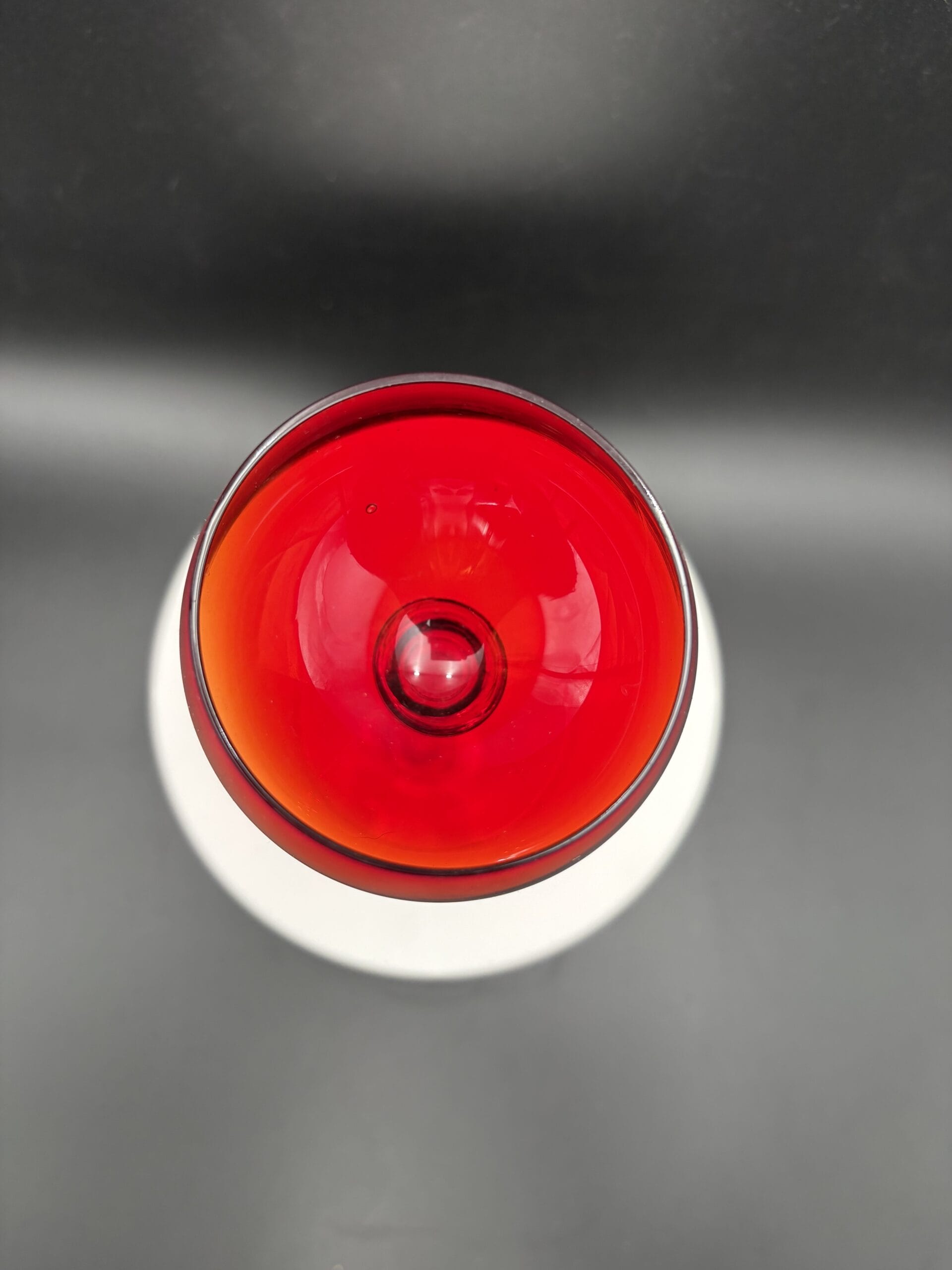 Højt og smukt vintage glas. Rødt med stilk og fod i klart glas. I fin stand.