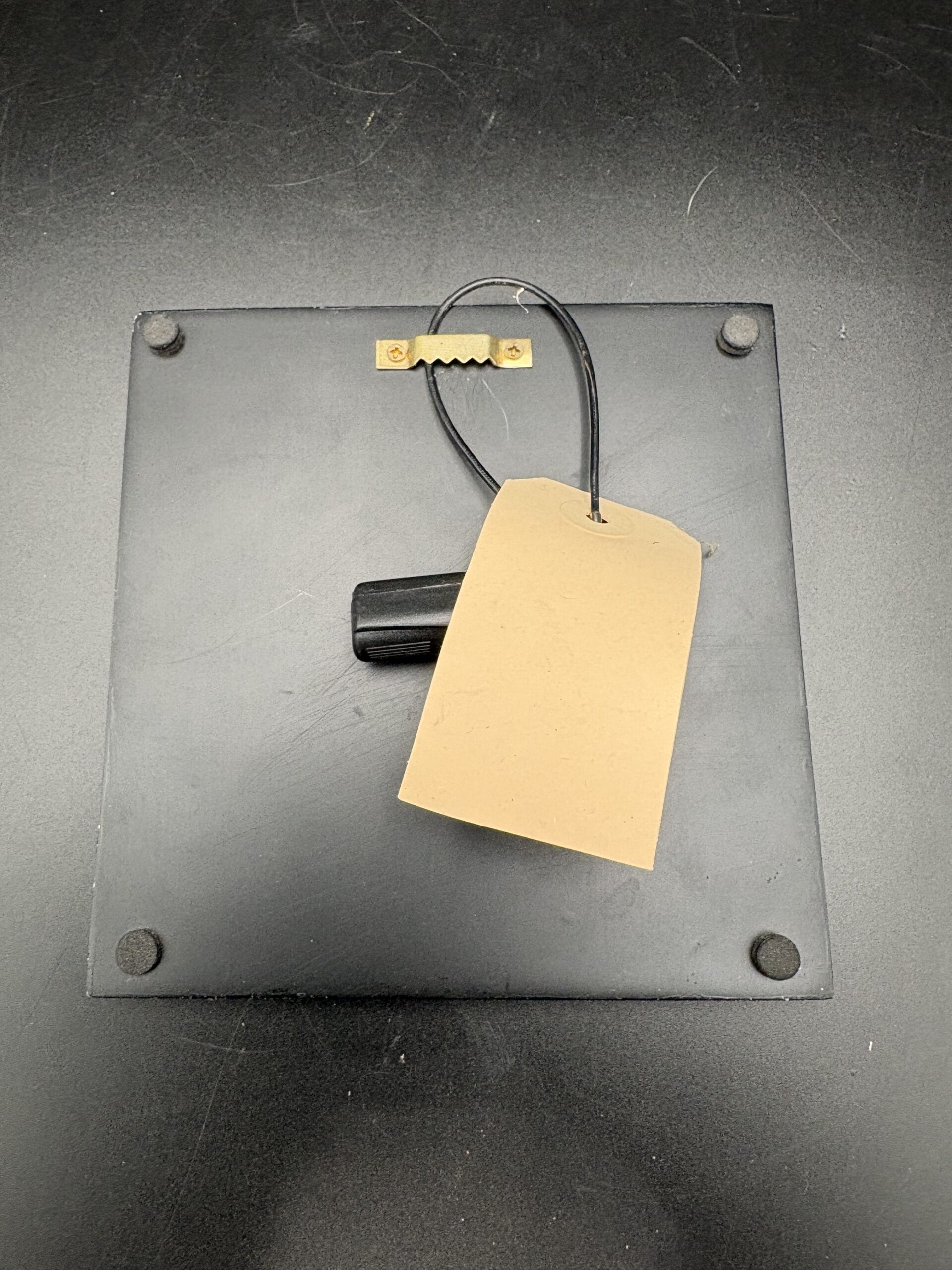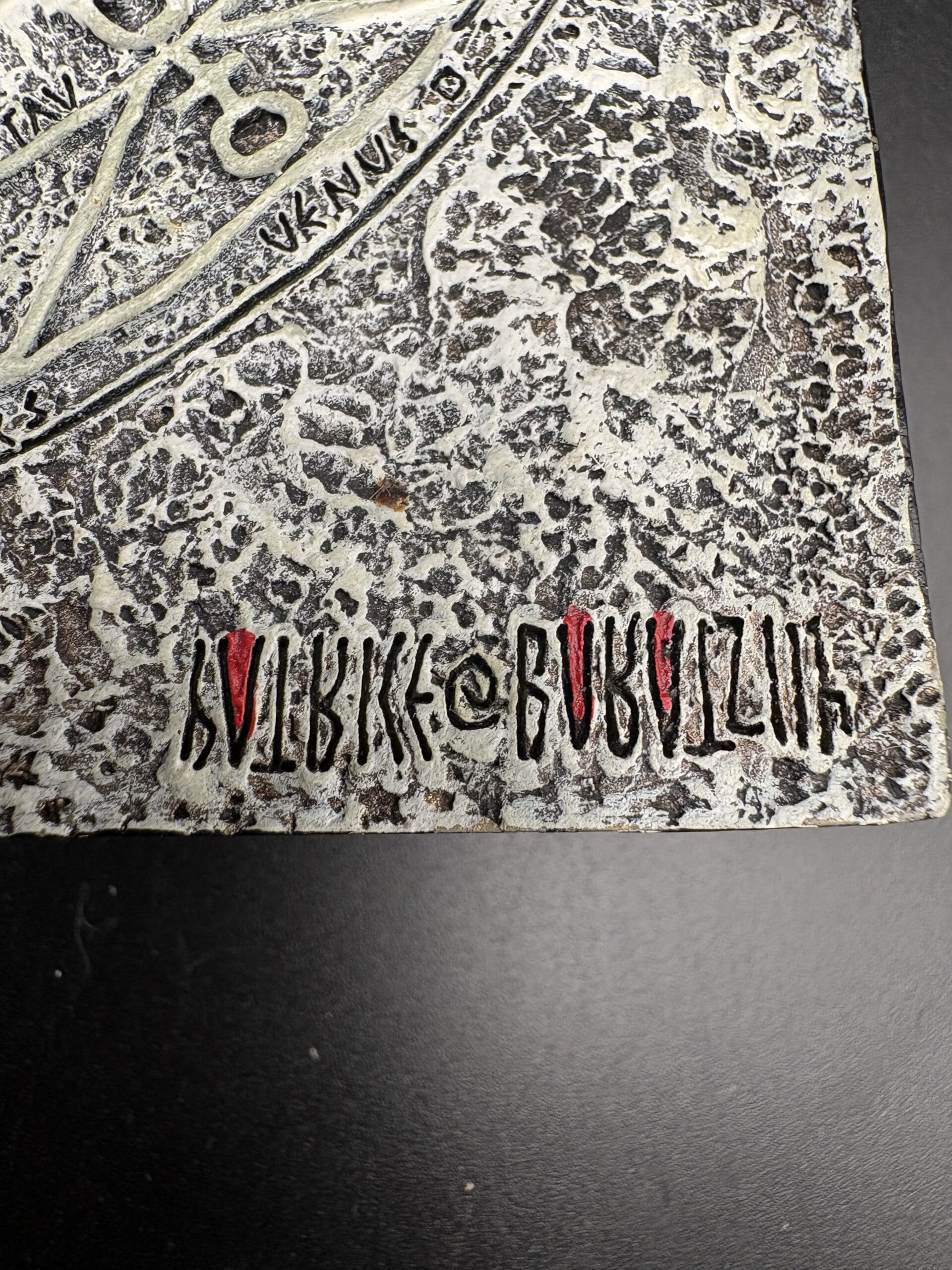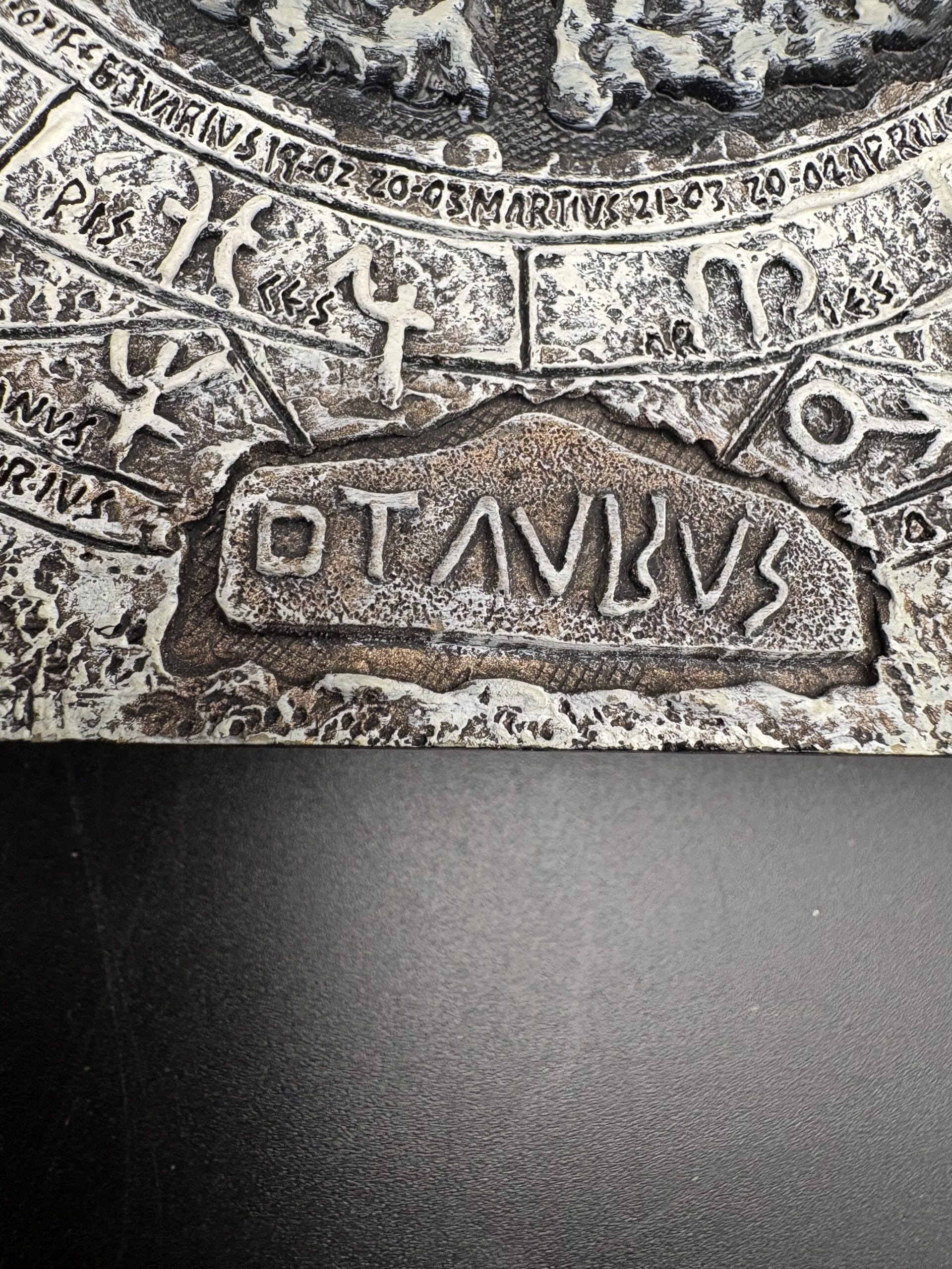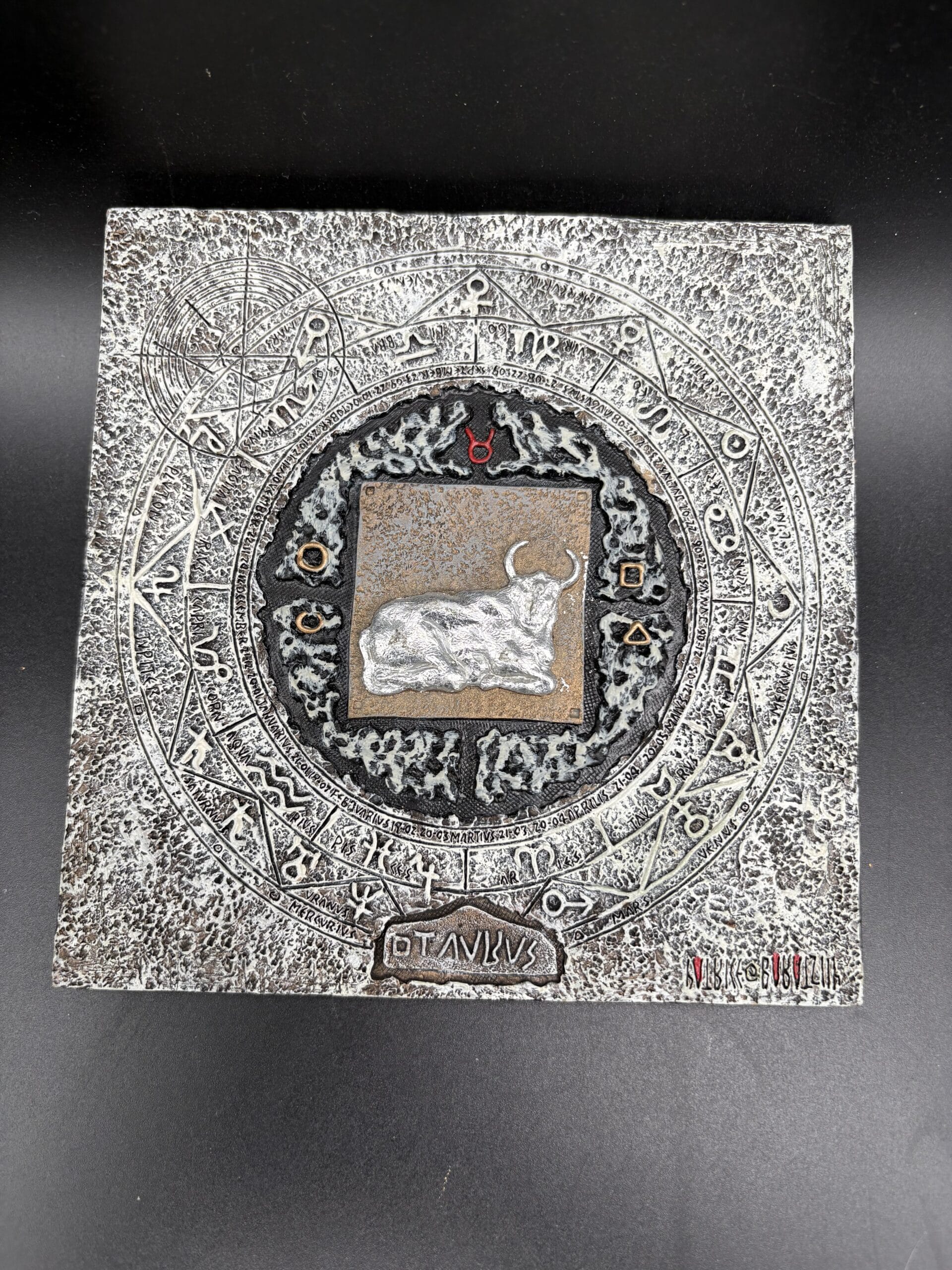 Fint lille relief med stjernetegnet tyren i midten, omgivet af dekorative symboler. Relieffet er udført i en stenlignende overflade, med detaljer i kontrastfarver.